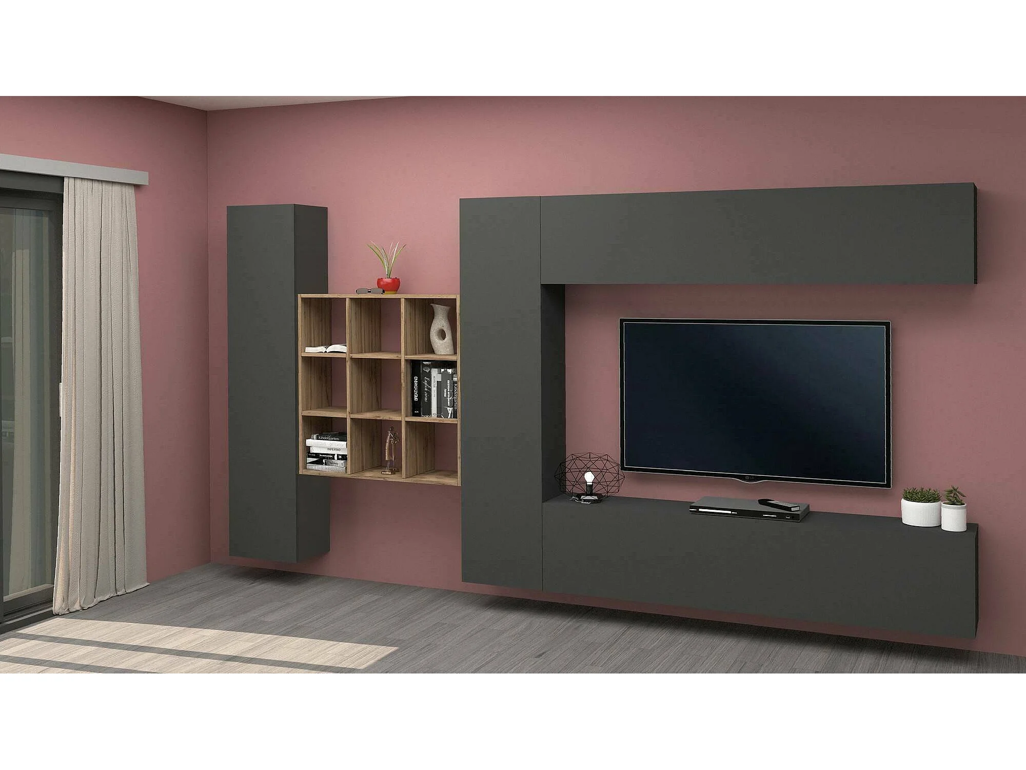 Pared Equipada Gualtiero, Conjunto de salón Mueble TV con 4 puertas, Mueble de salón polivalente, 100% Made in Italy, cm 350x30h180, Antracita