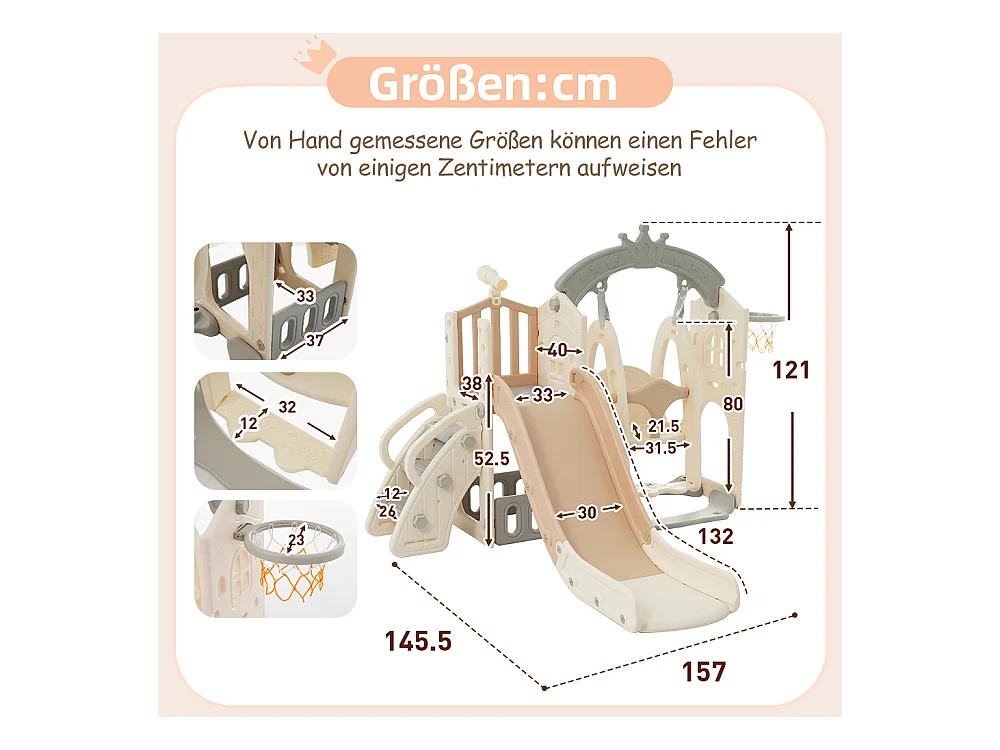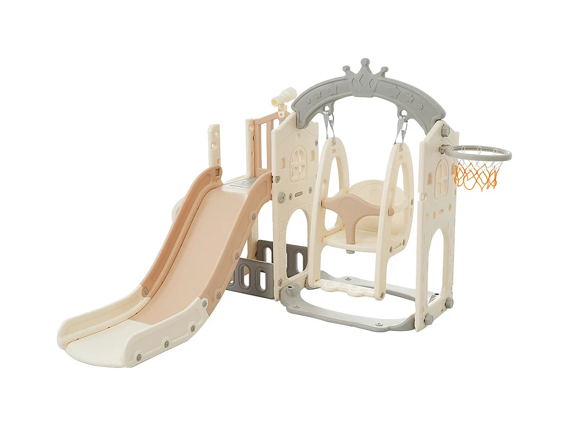 Tobogán infantil 5 en 1 con columpio, tobogán, escaleras, aro de baloncesto y espacio de almacenamiento, para interior, HDPE, gris antiguo (179 x 184 x 103 cm)