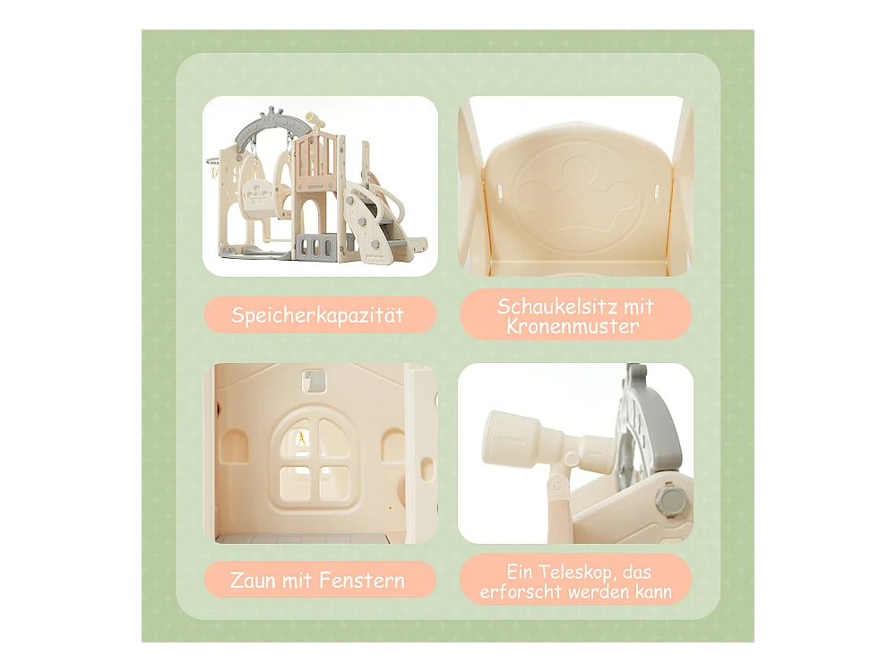 Parque infantil multifuncional 5 en 1 con tobogán, columpio, escalera, anillas, telescopio y caja de almacenamiento - Madera HDPE (157 x 145 x 121 cm)
