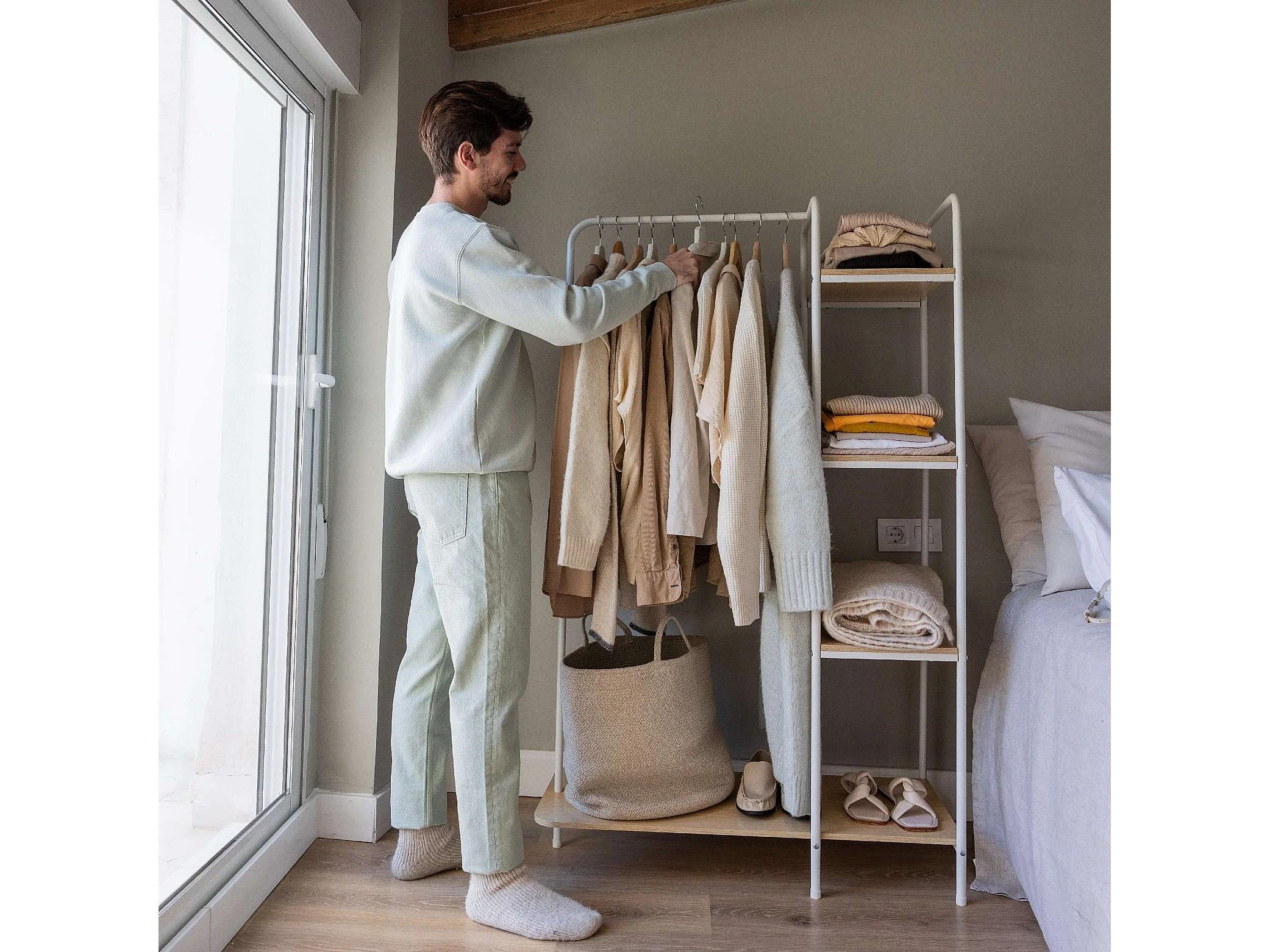 DON HIERRO - Perchero Metálico con Ruedas URBAN - 3 Estanterías Amplias y Cesta para Accesorios-
