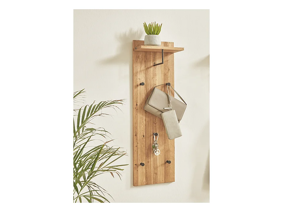 Perchero de pared de diseño industrial en roble y metal negro con 5 ganchos y estante Lorna