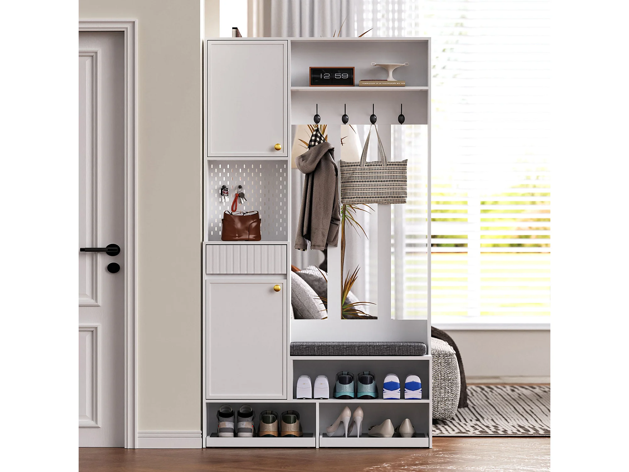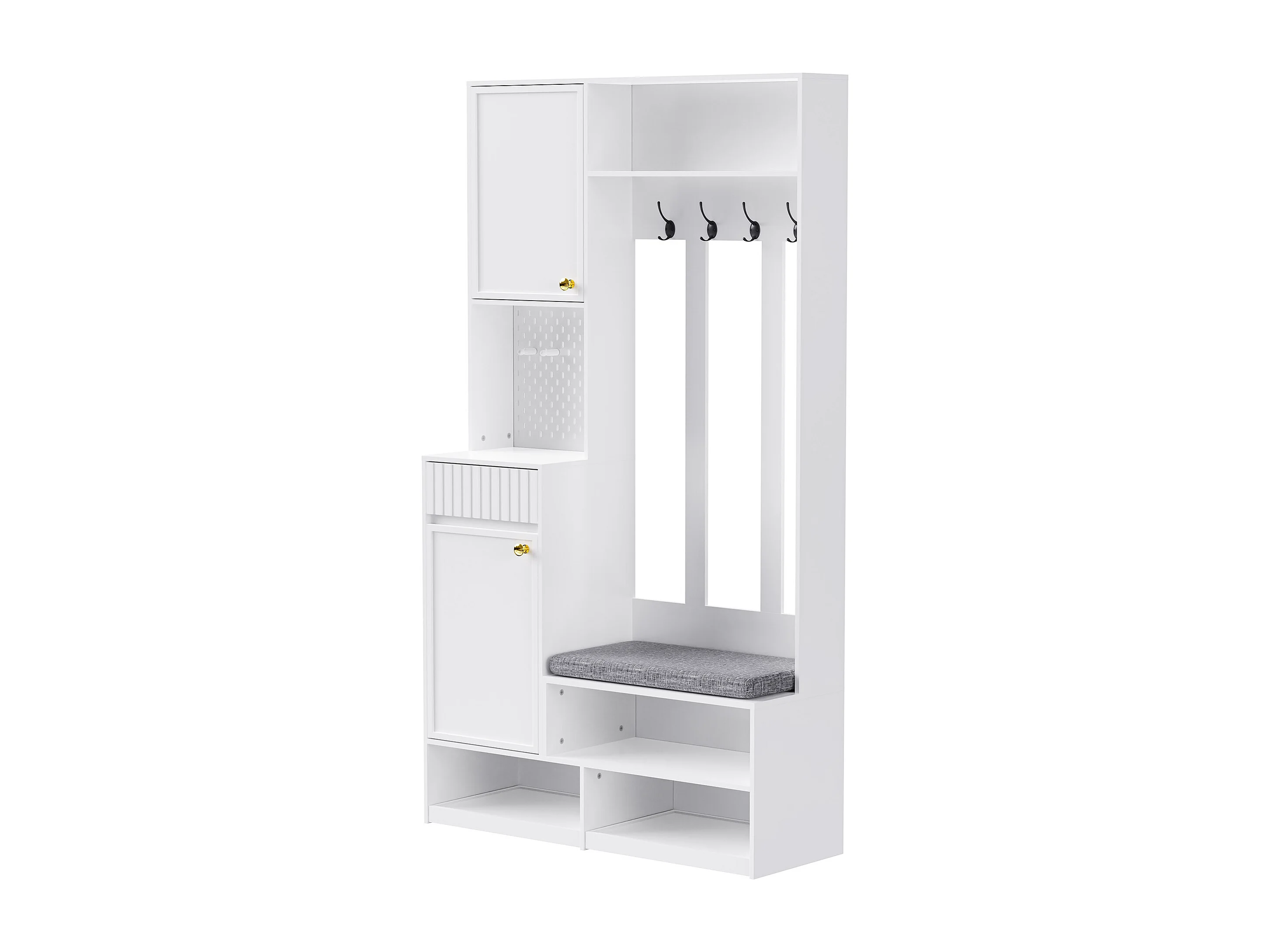 Perchero de pasillo con banco tapizado, 4 ganchos, cajones y puertas - blanco - 100x35x180 cm