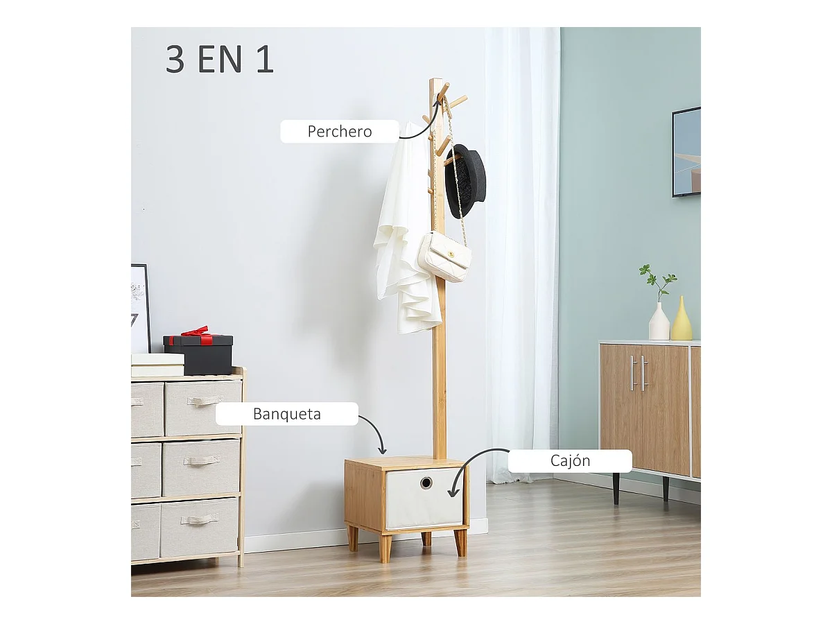 Perchero de pie con banco madera natural 35x35x177 cm HOMCOM