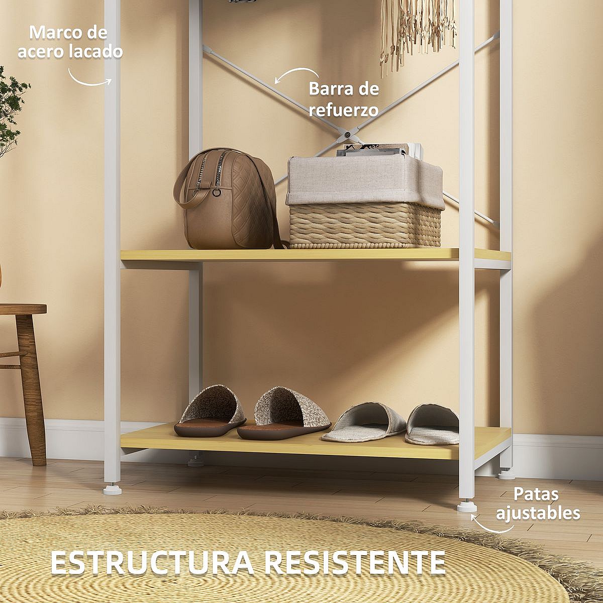 Perchero Natur Homcom 4 estantes + barra para colgar + colgador natural 155x90x30 cm
