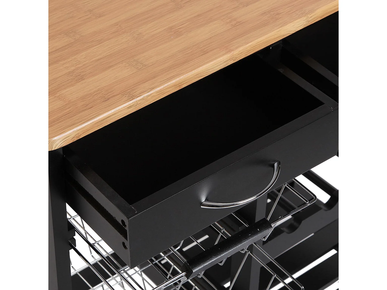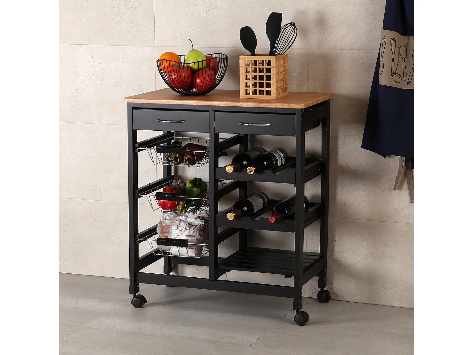 Picton Carro de cocina con ruedas, cajones y botellero, Verdulero con despensa y organizadores, Negro y marrón, 76x37x66cm