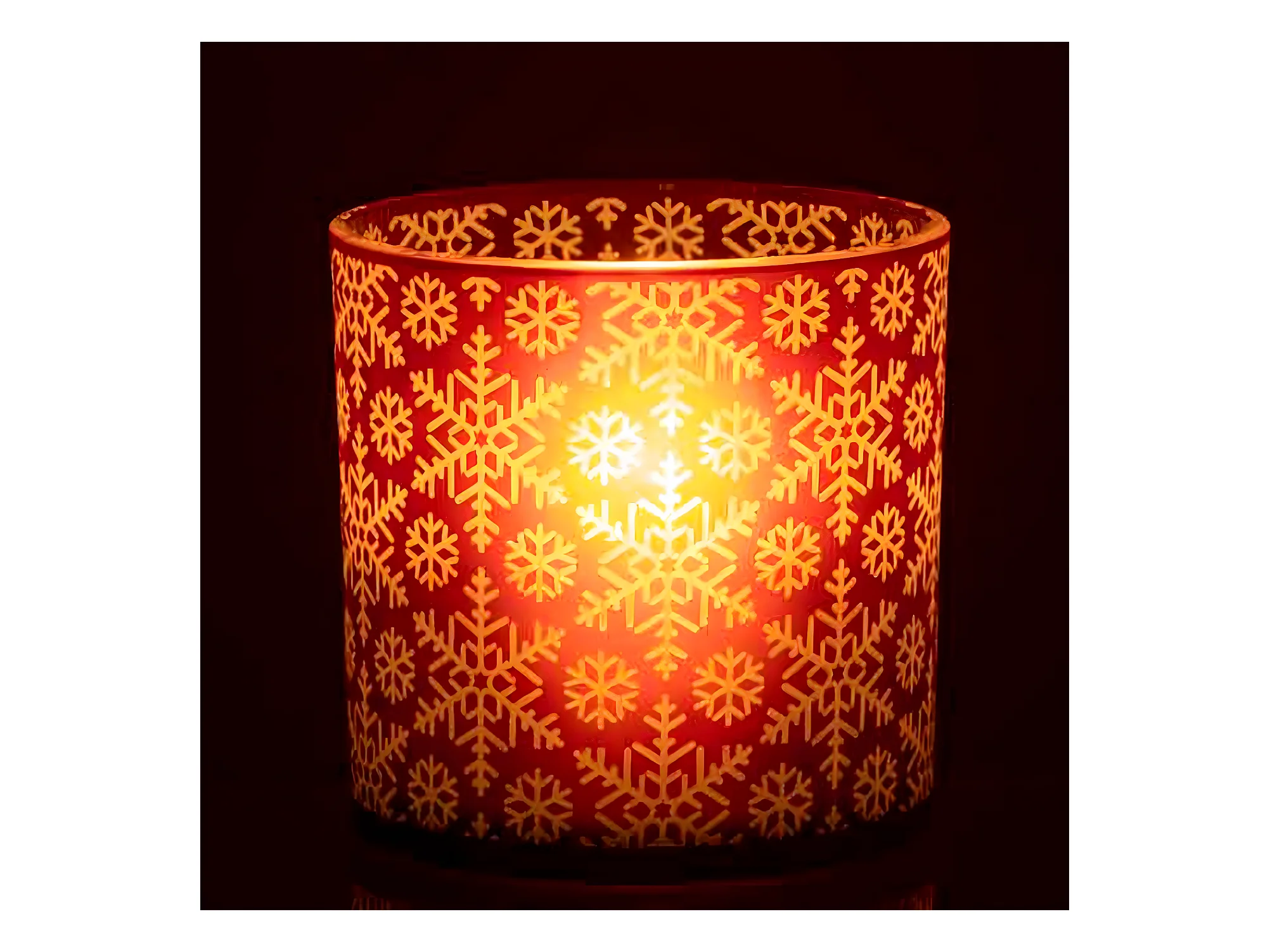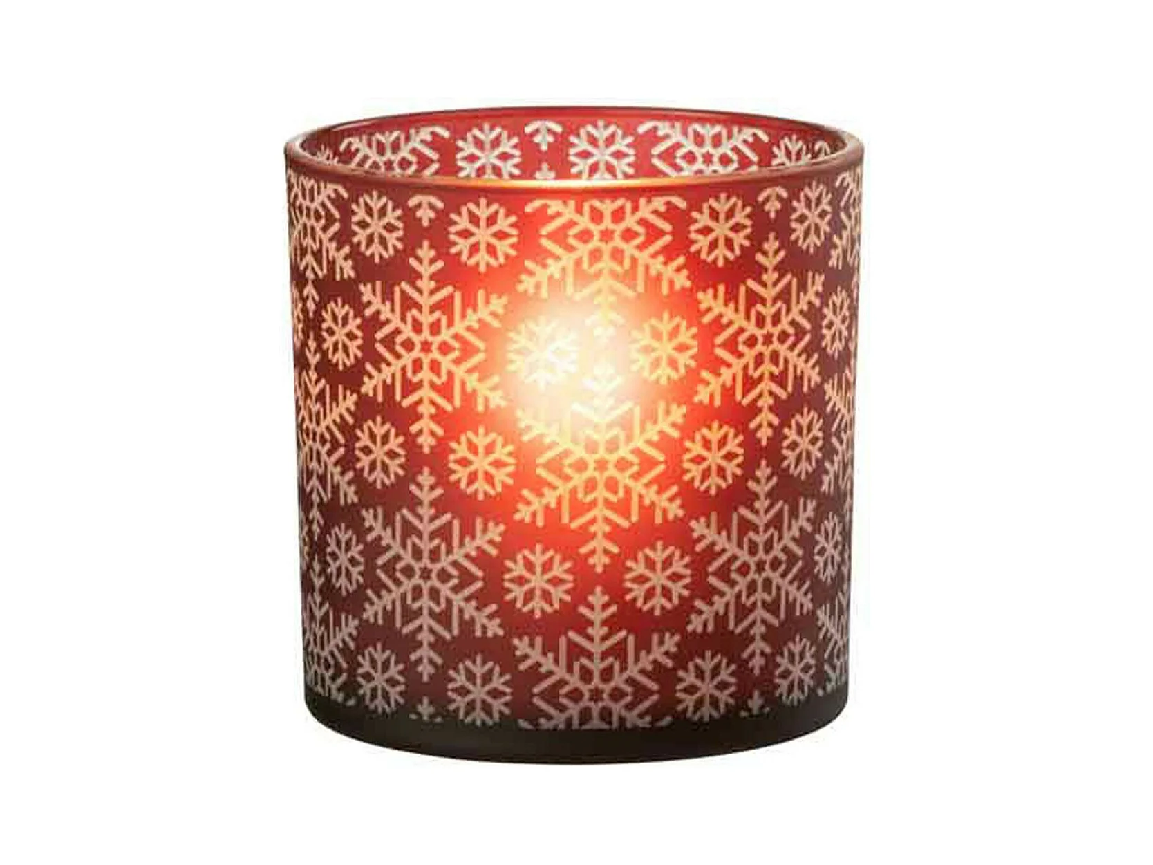 Portavelas con copos de vidrio rojo de 15x15x15cm