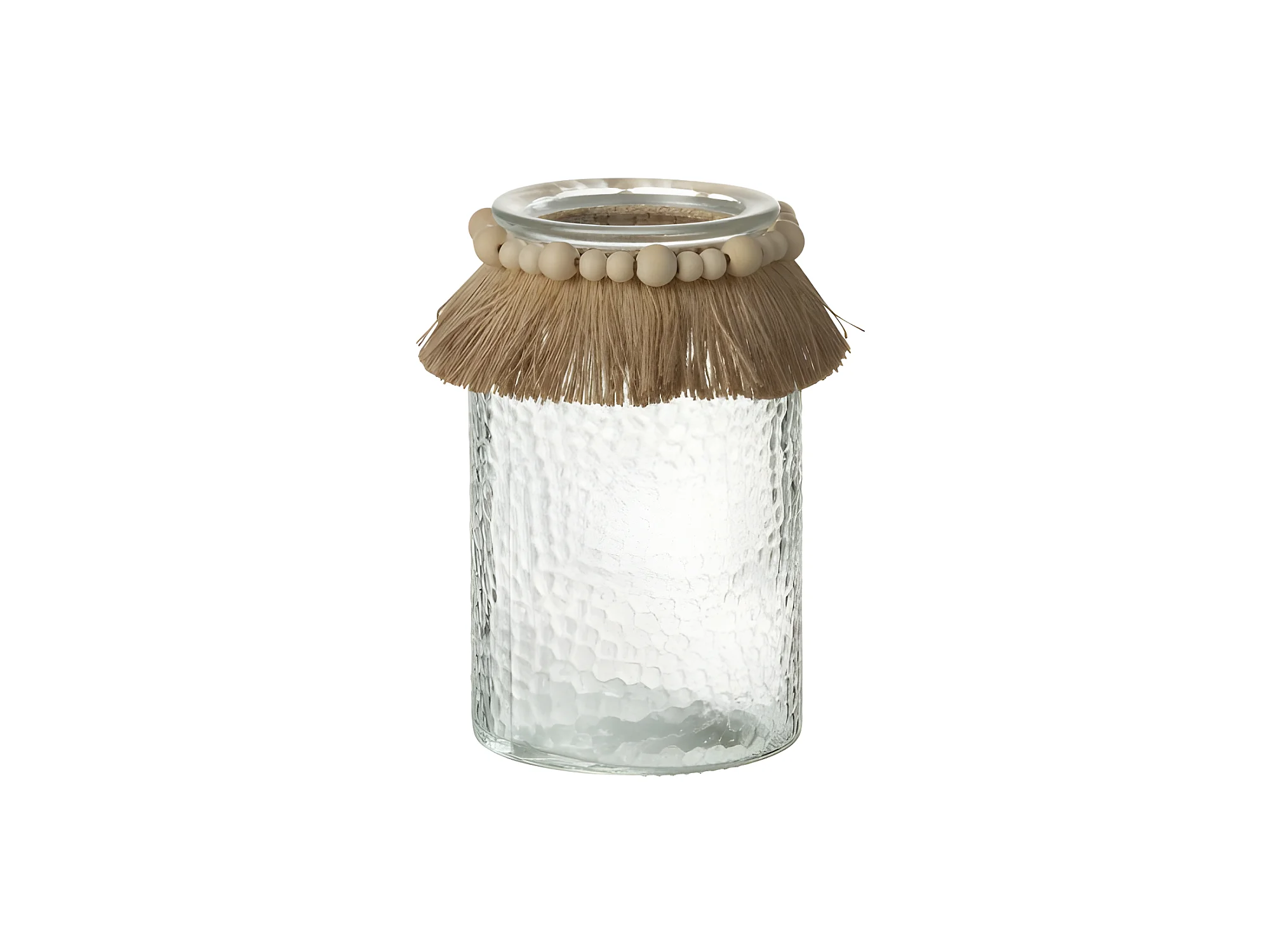 Portavelas con cuello de rafia en vidrio transparente 12x12x18 cm