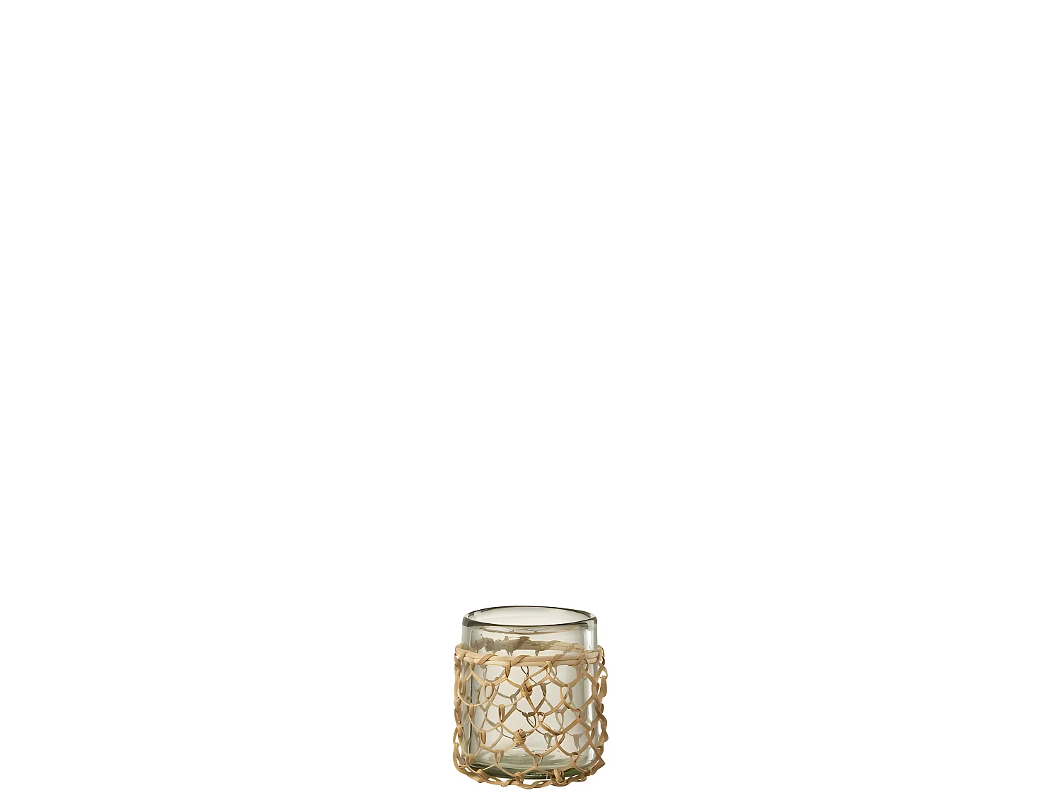 Portavelas con red de ratán en vidrio transparente de 9x9x10 cm