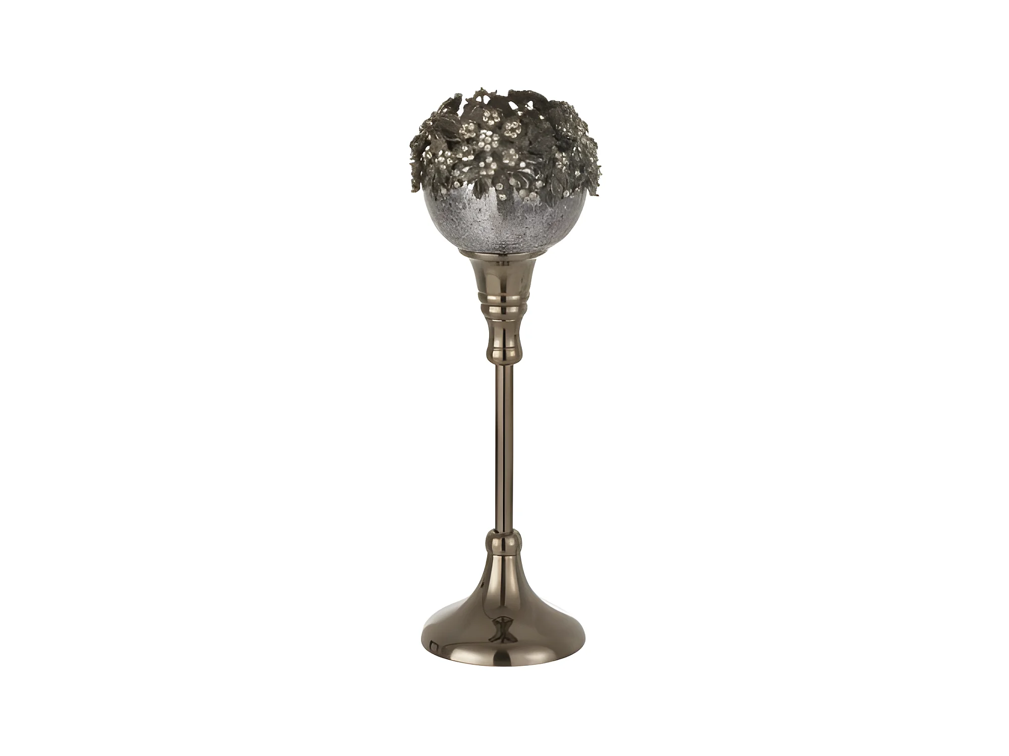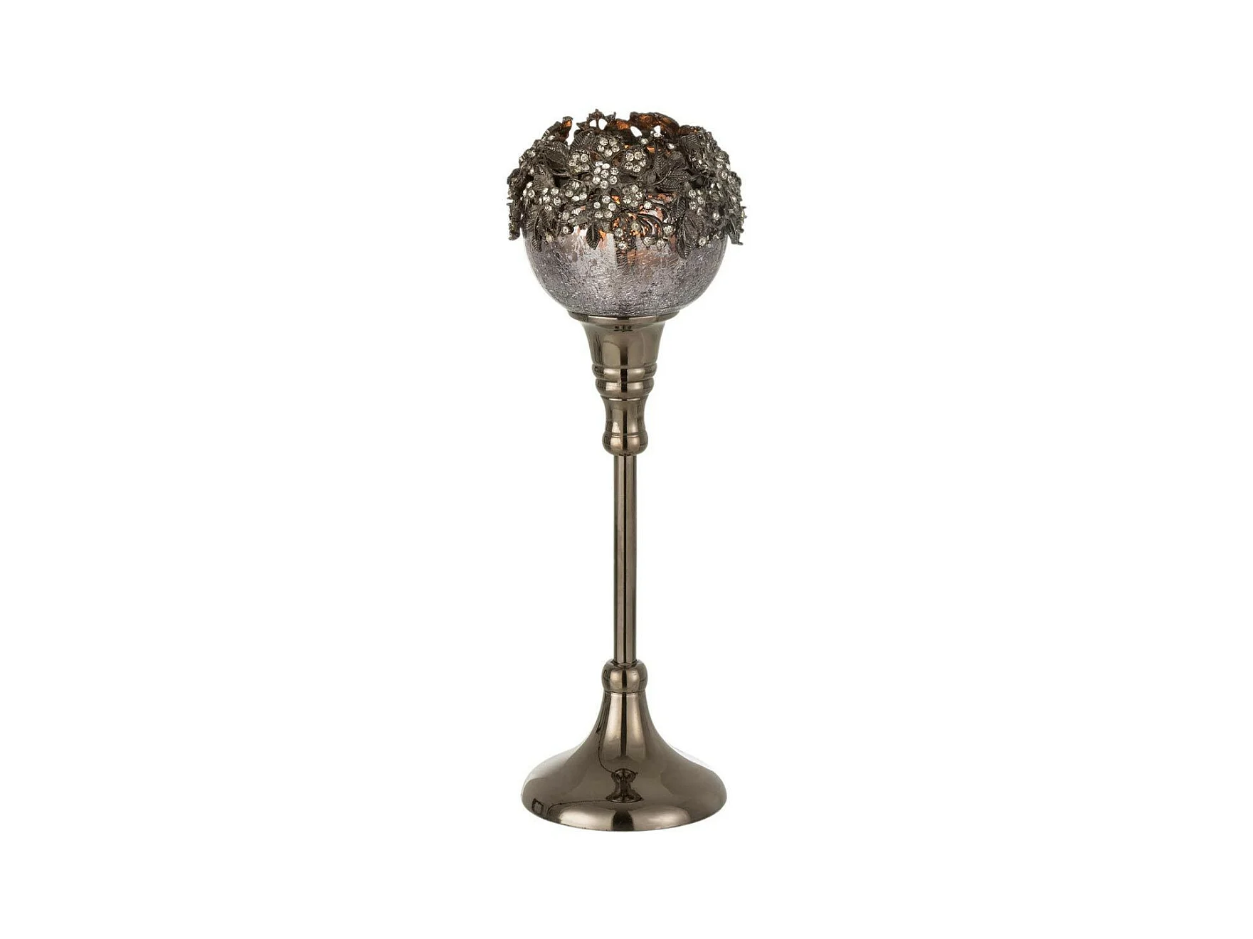 Portavelas de pie decorado con pedrería de aluminio gris de 9x9x28 cm