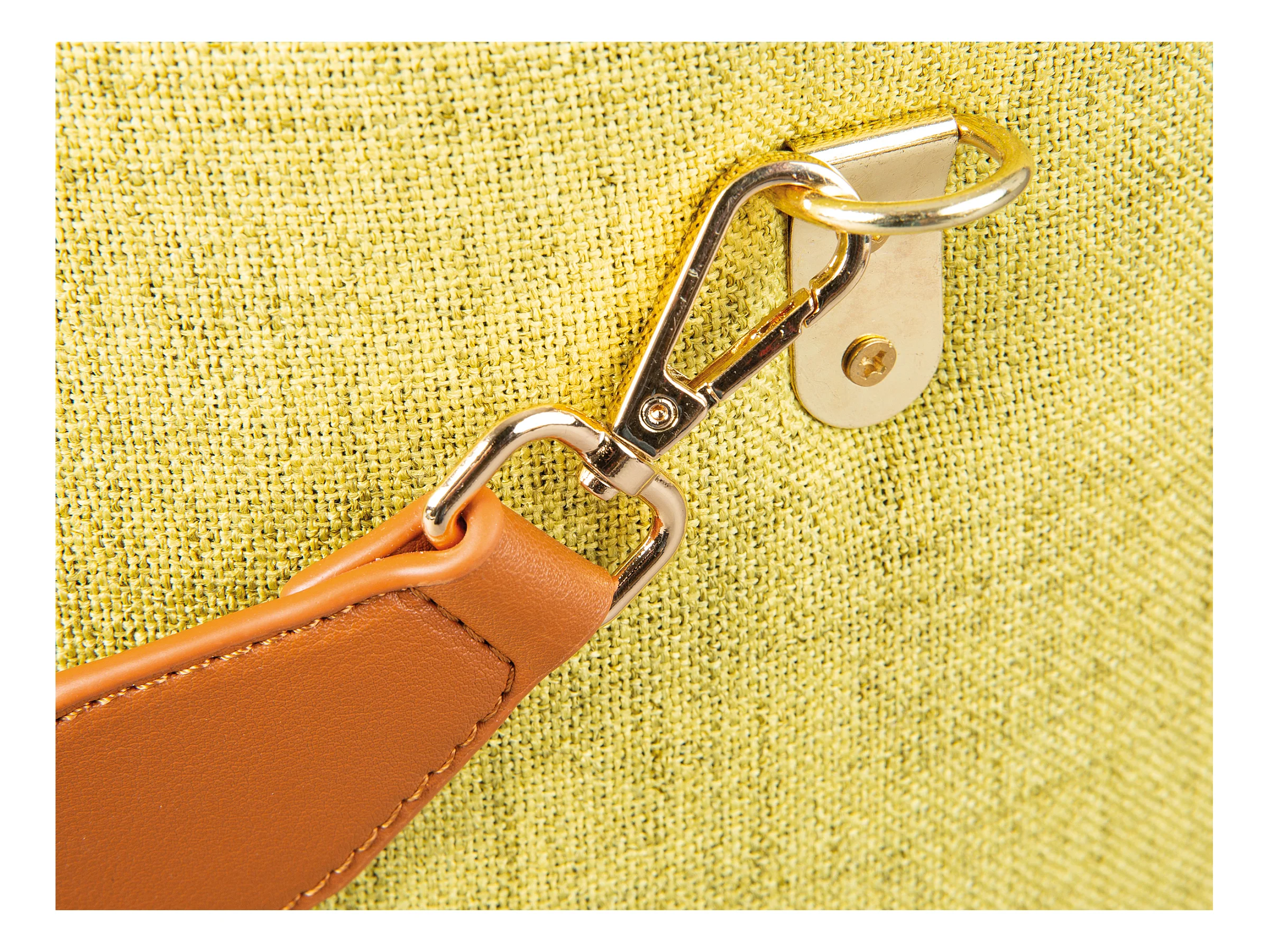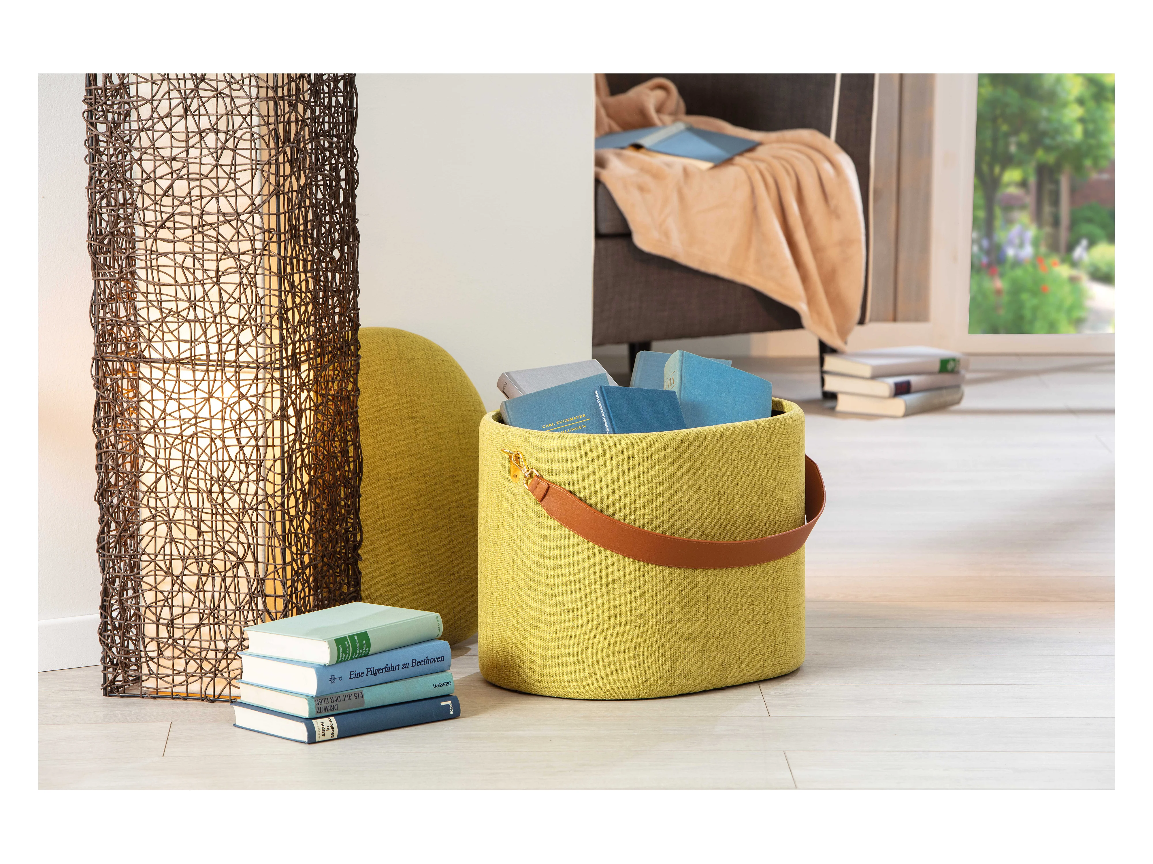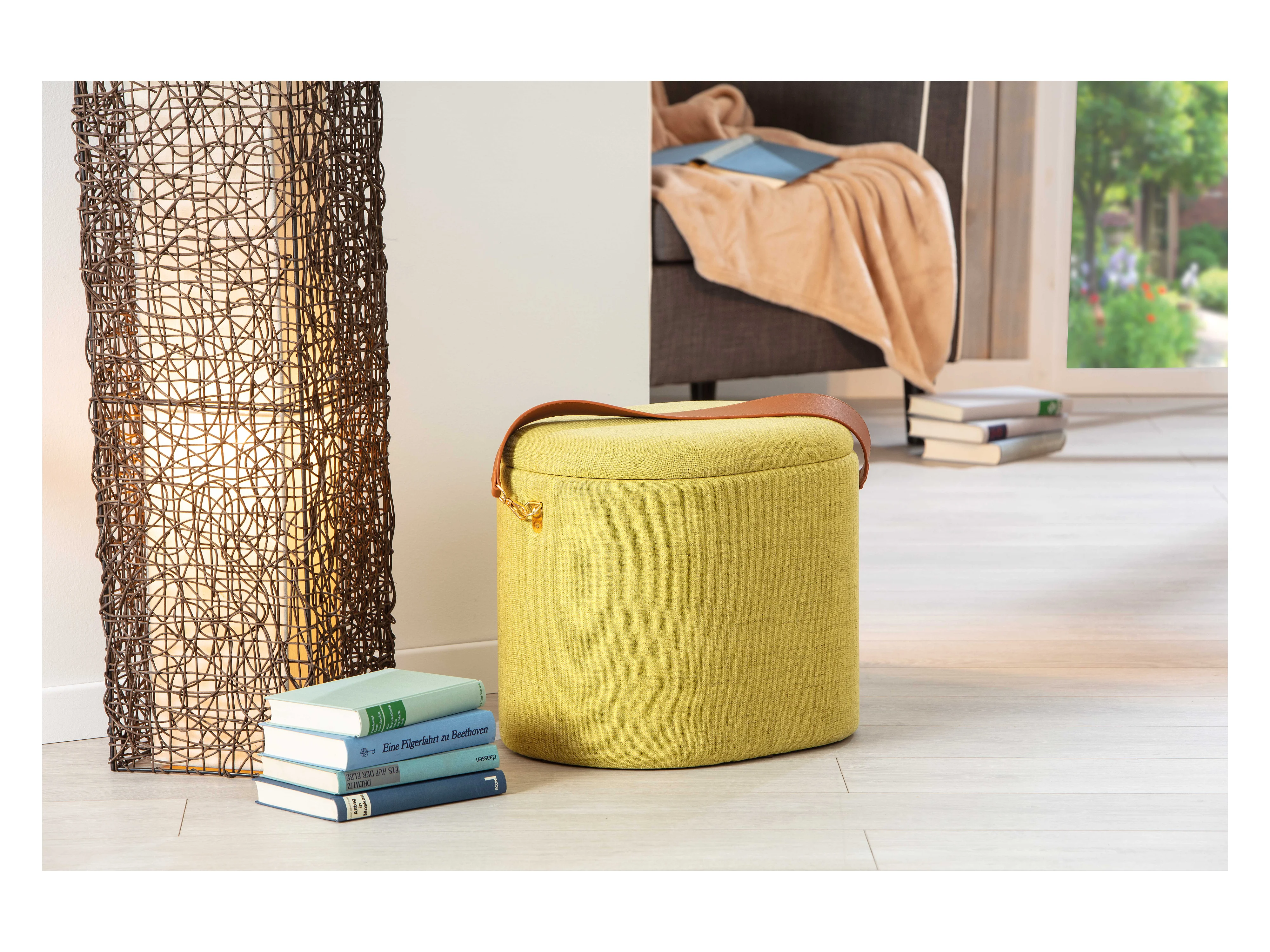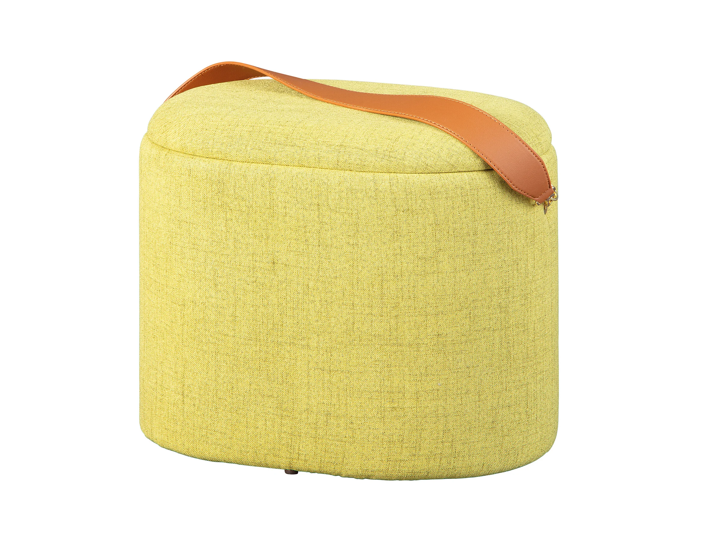 Puf Ymas, taburete con almacenaje de color amarillo verdoso y marrón.