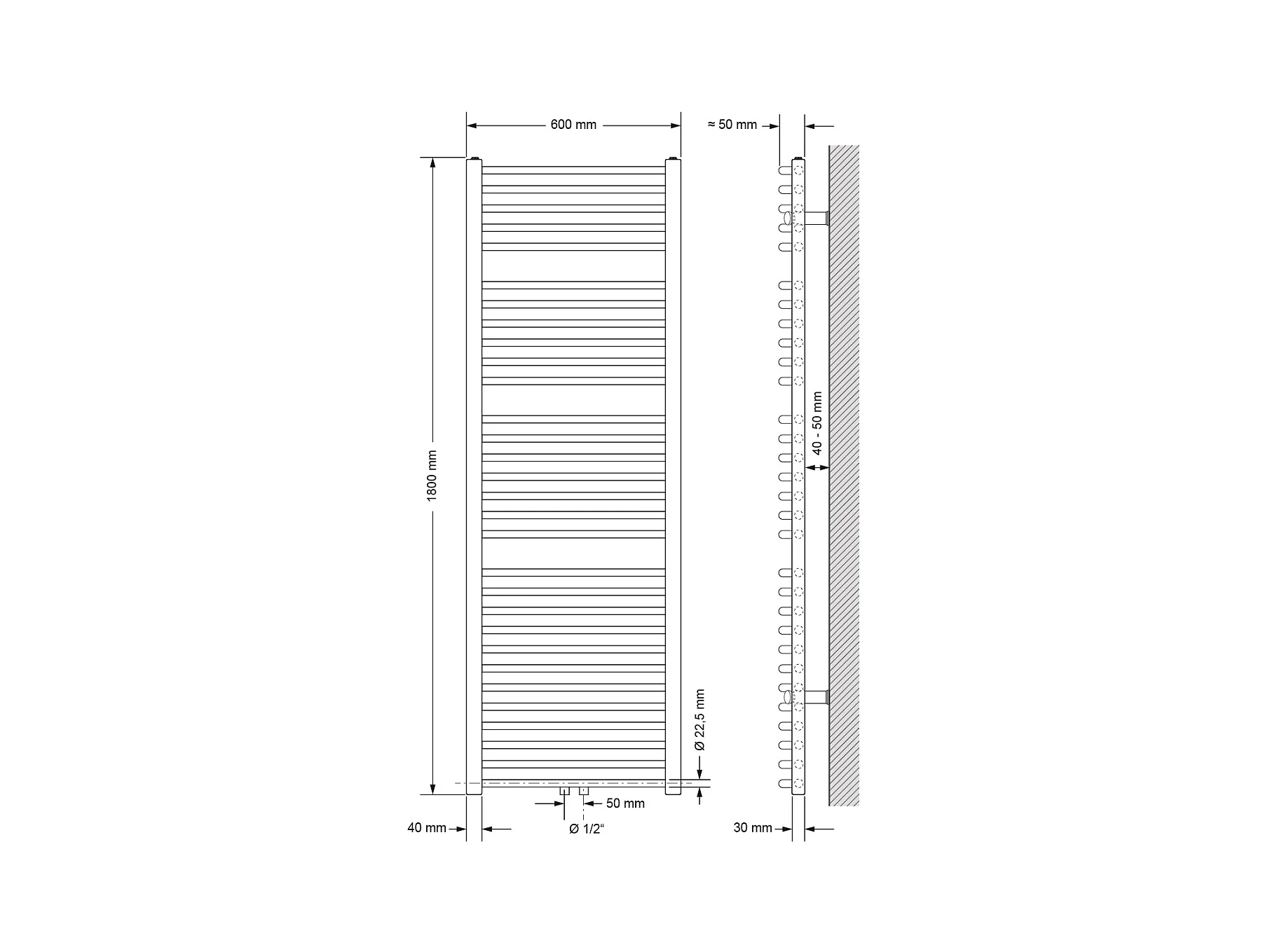Radiador de baño Sahara recto con conexión lateral para radiador blanco 600x1800 mm