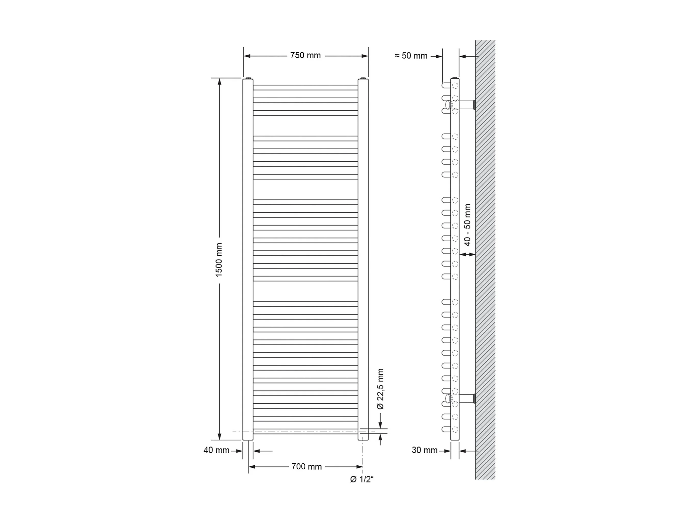 Radiador toallero Sahara Design, 750 x 1500 mm, blanco, conexión lateral