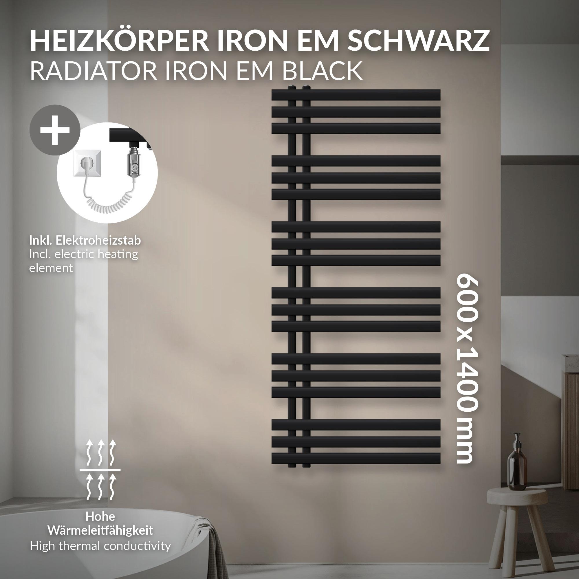 Radiador toallero eléctrico negro mate 600 x 1400mm con elemento calefactor 900W