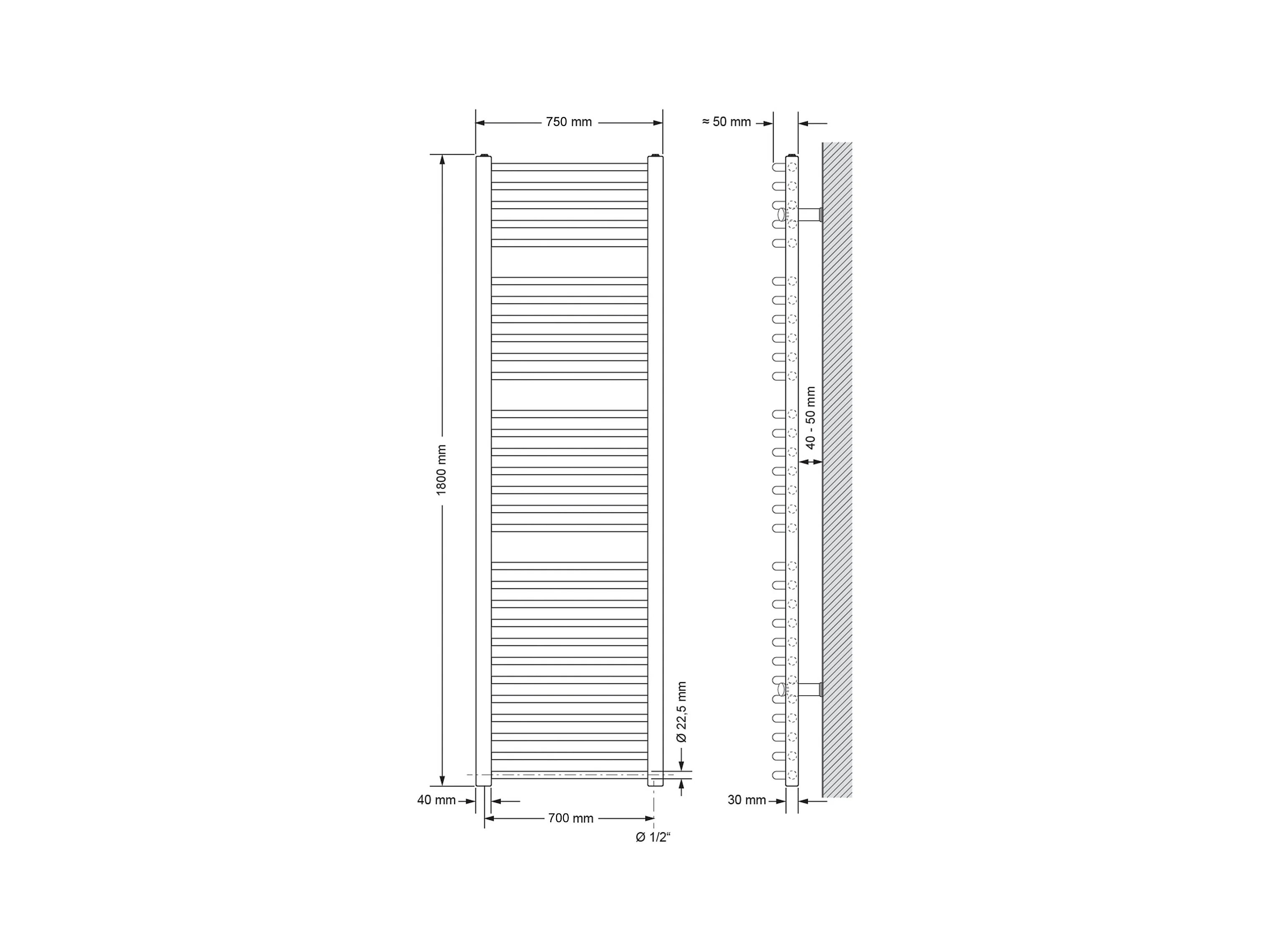 Radiador toallero Sahara, 750 x 1800 mm, blanco, recto con conexión lateral