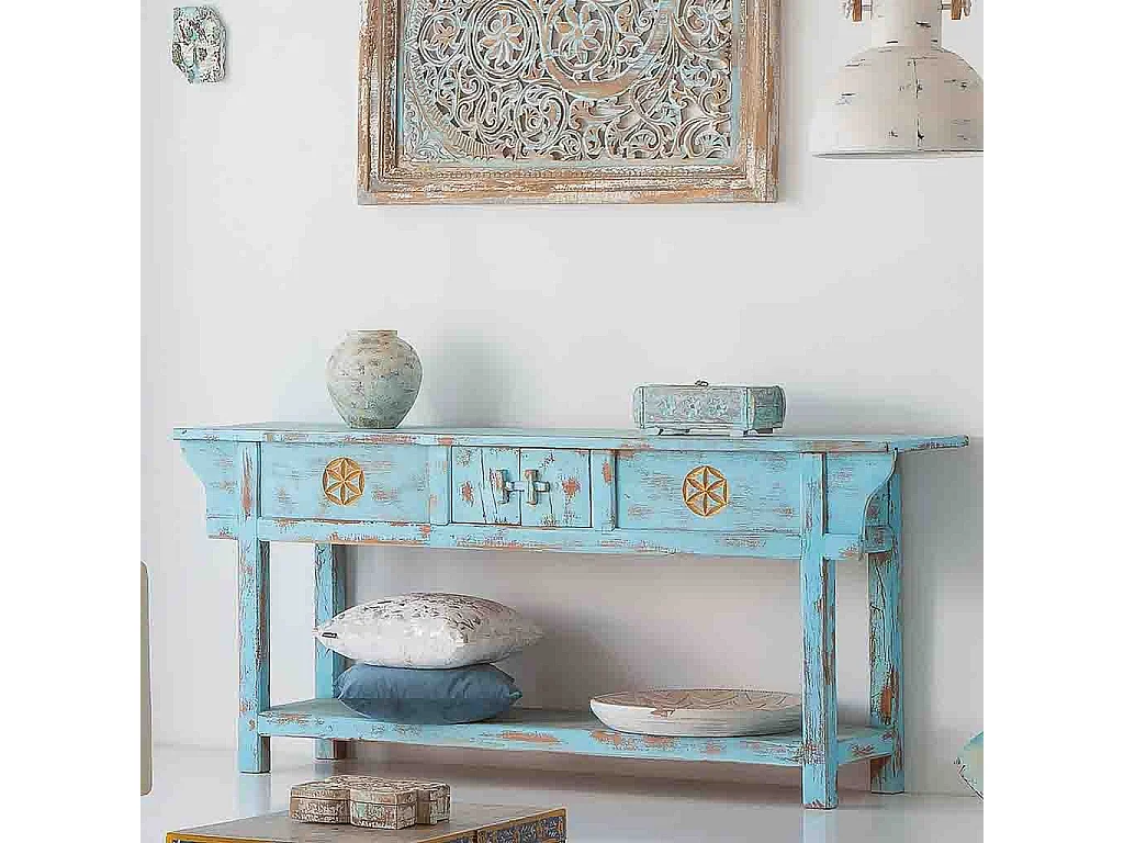 Recibidor de madera acabado artesanal envejecido azul 181x45x80