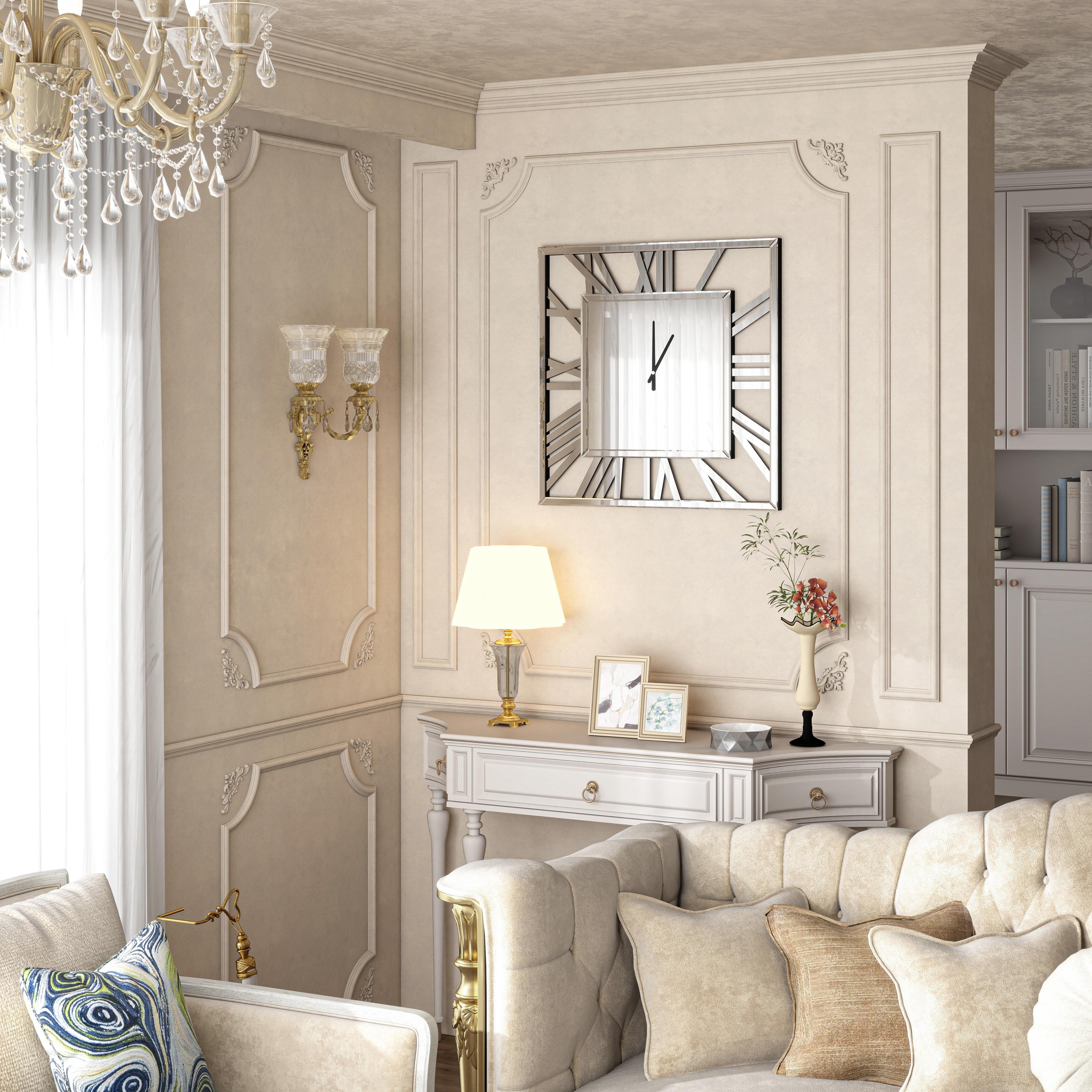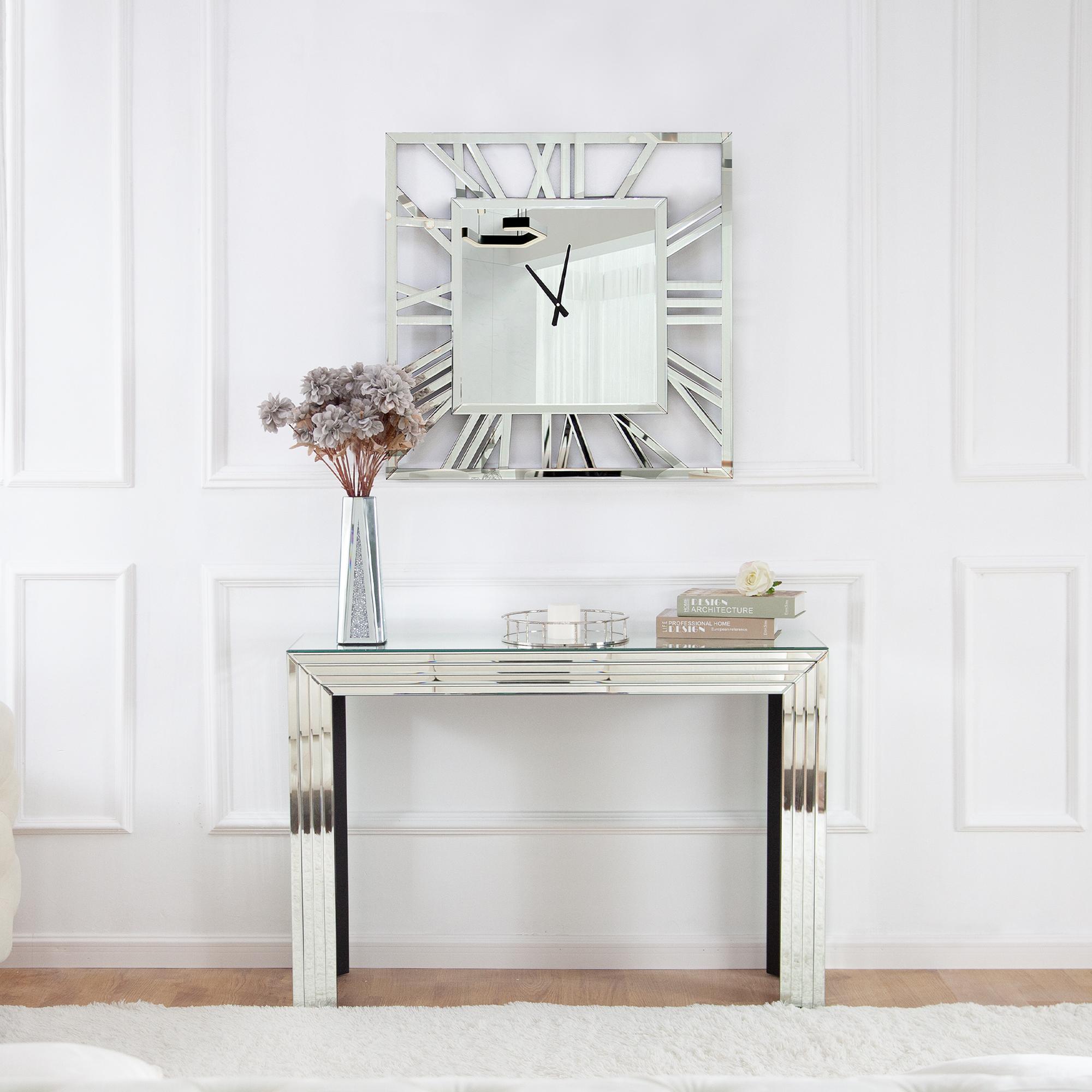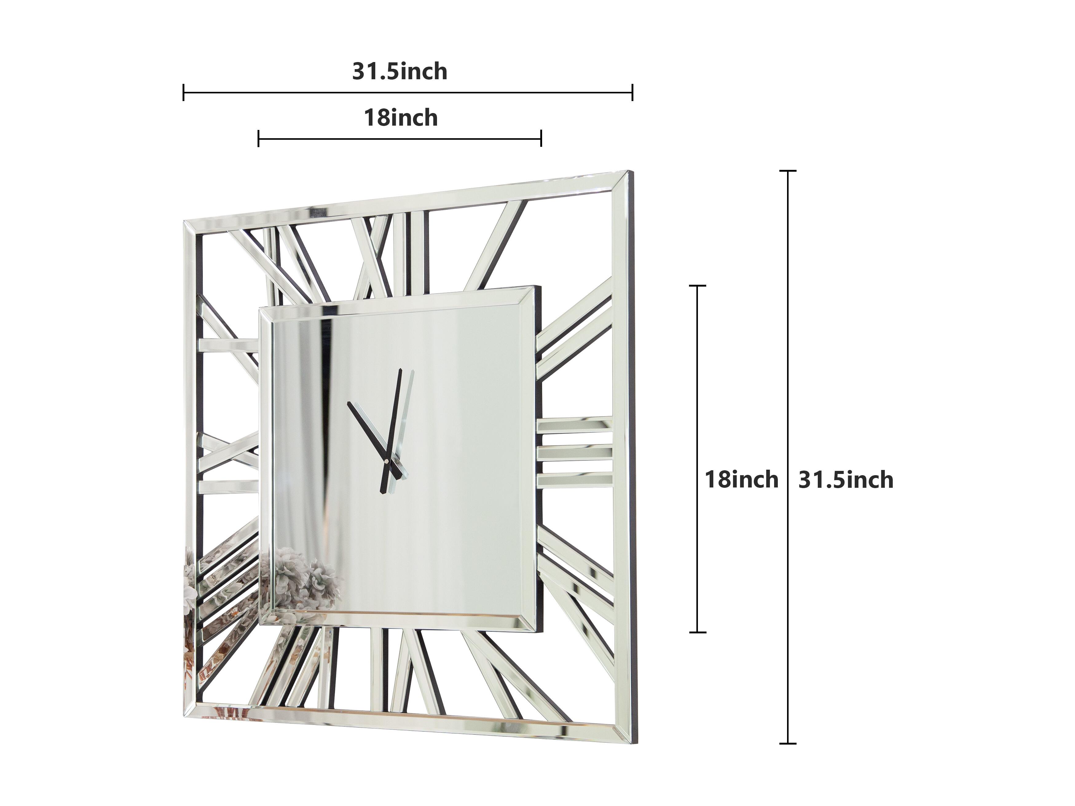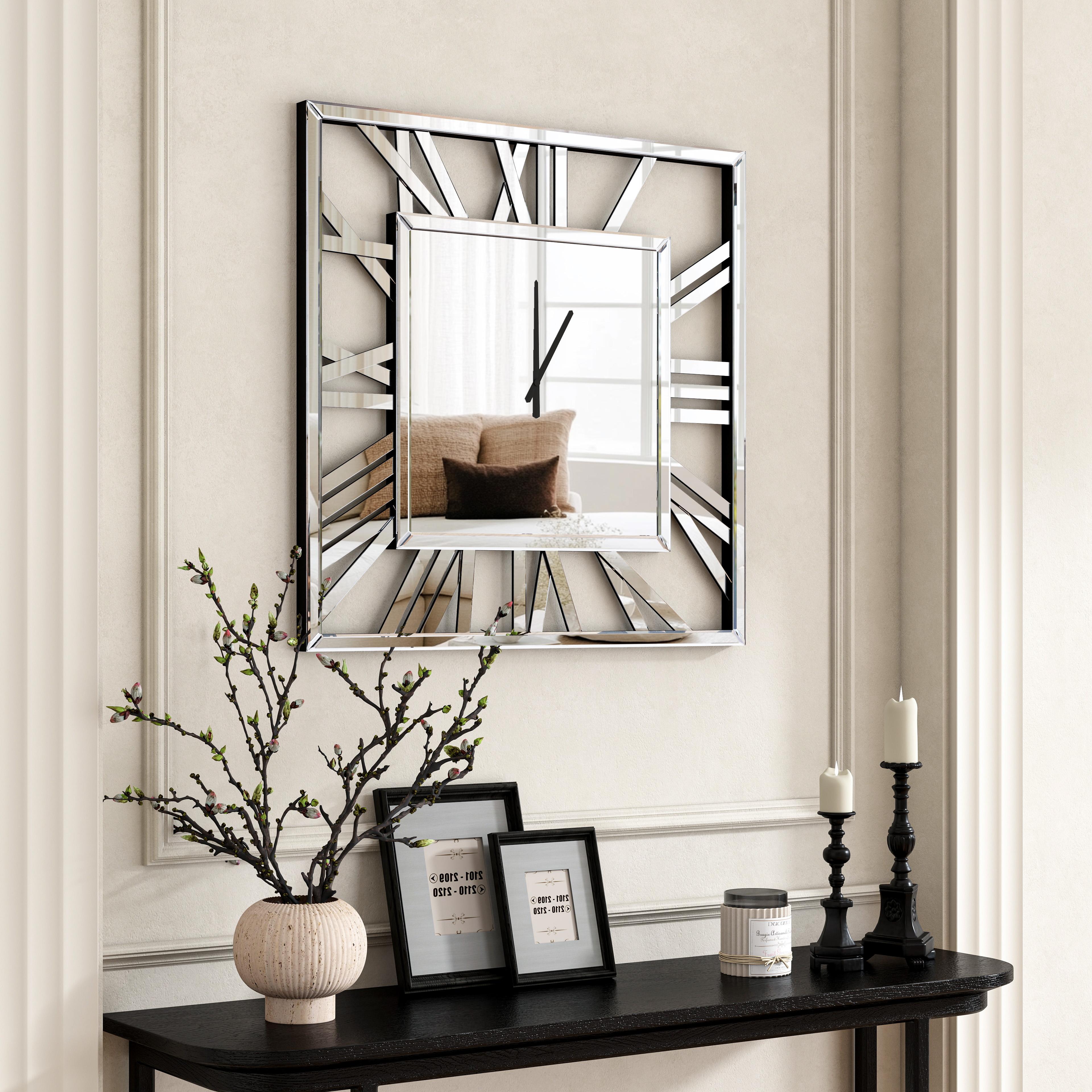 Reloj de pared moderno con espejo de cristal, diseño elegante, MDF y cristal, plateado (68x60x3,8 cm)