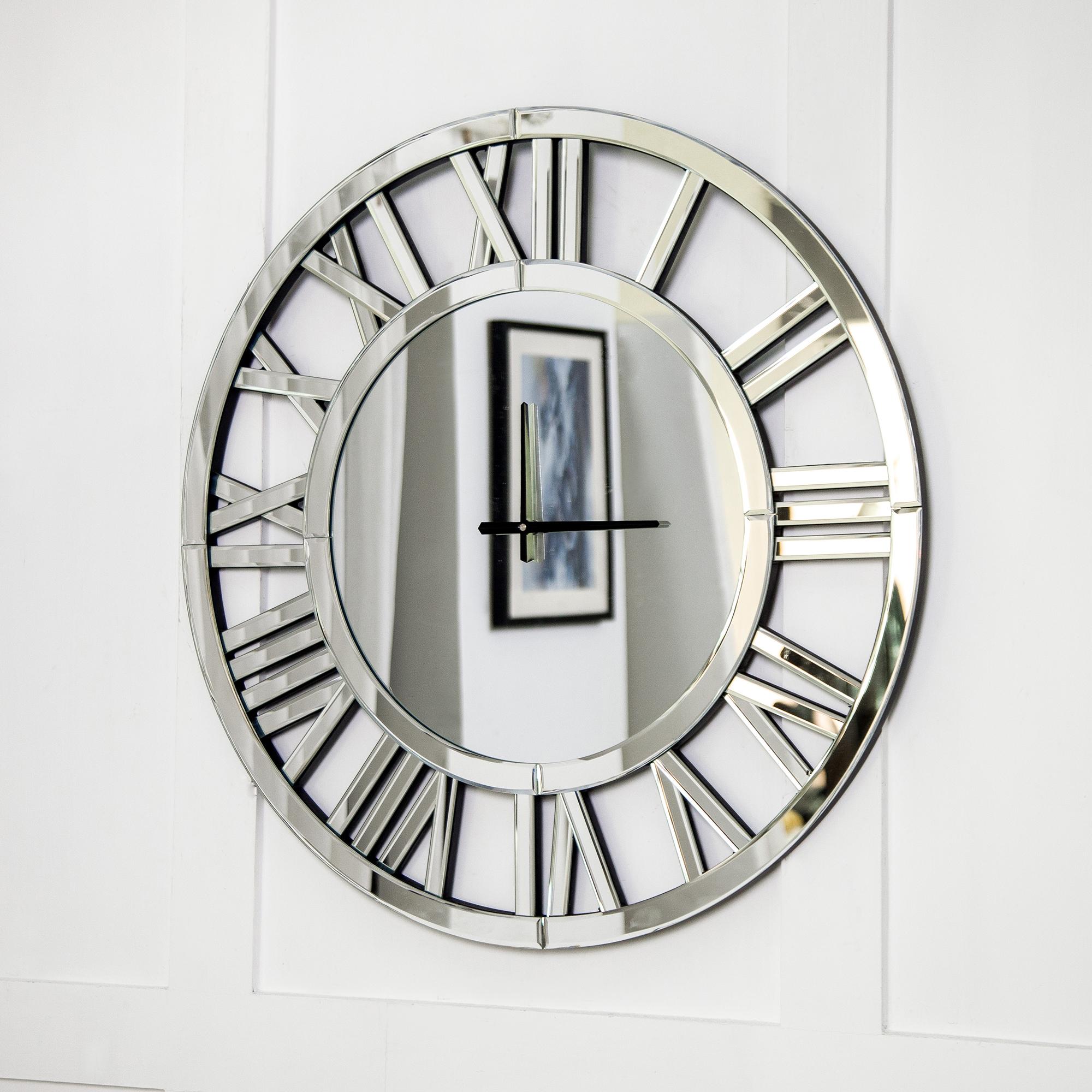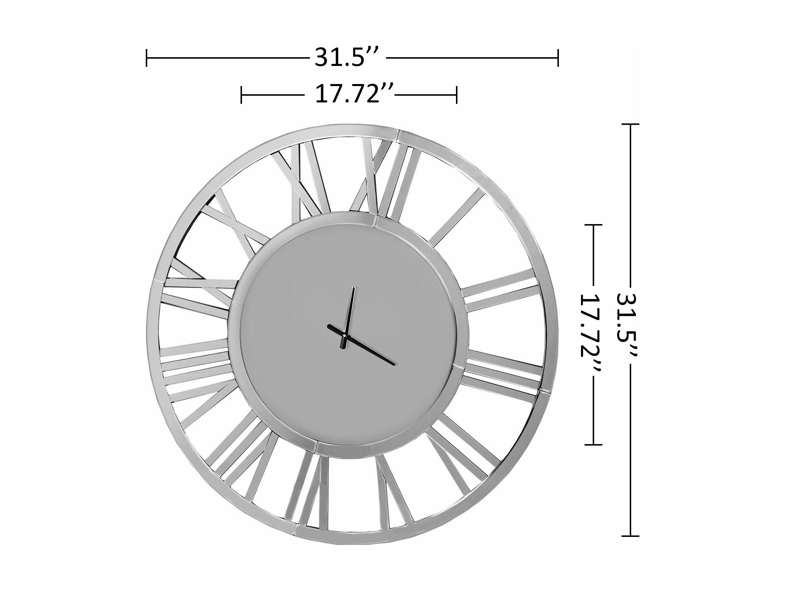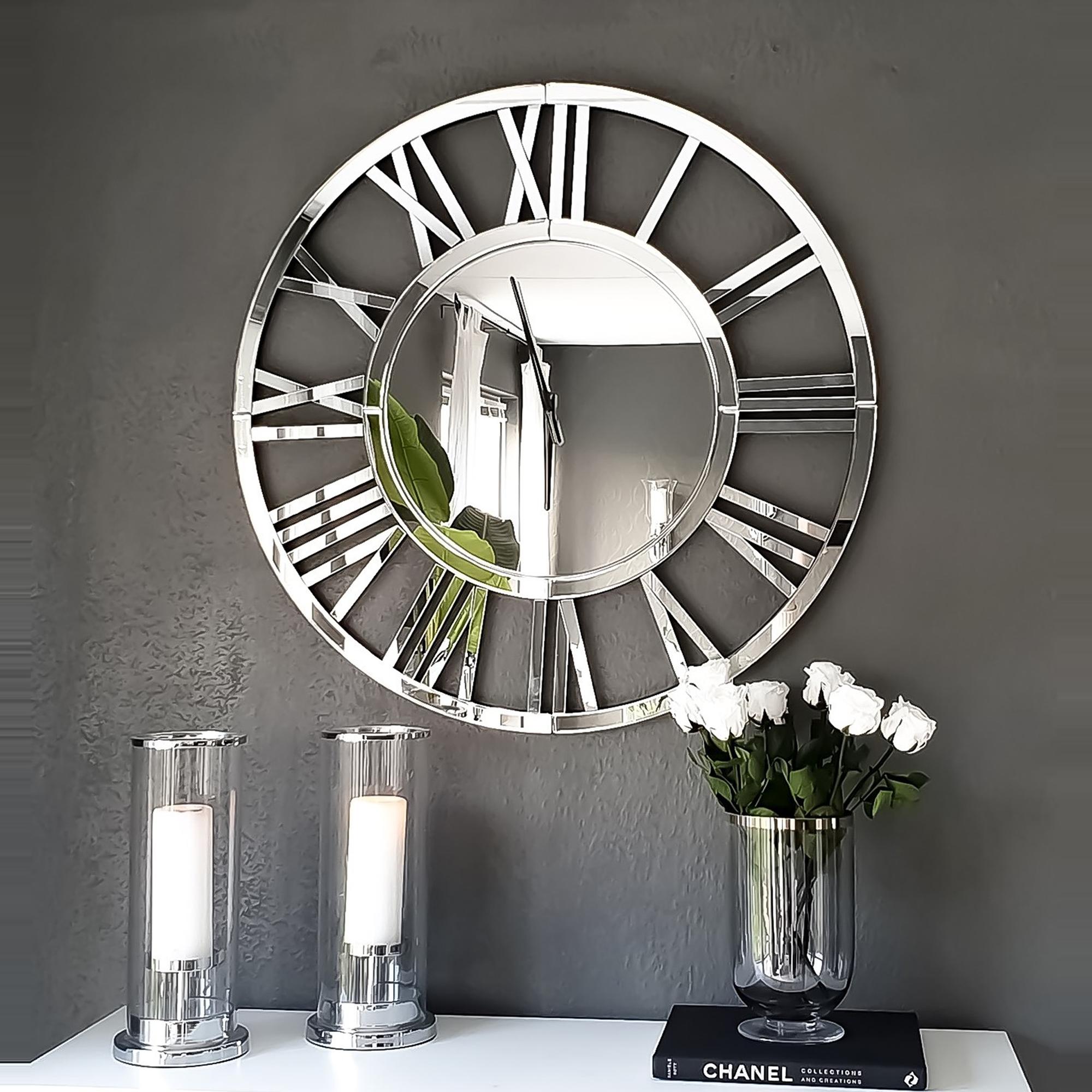 Reloj de pared moderno con espejo de cristal, diseño elegante, MDF y cristal, plateado (68x60x3,8 cm)