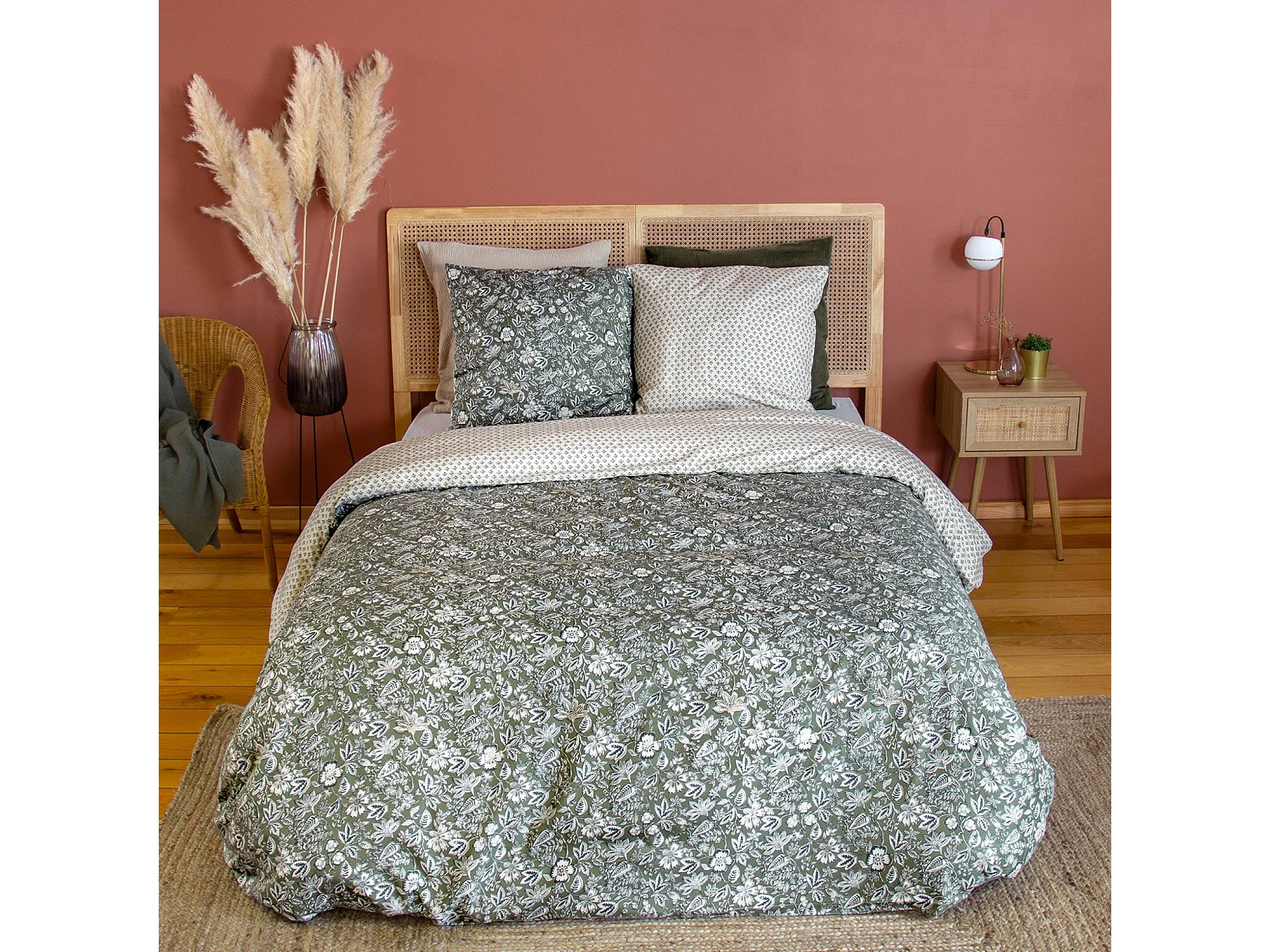 Ropa de cama de algodón y lyocell con estampado floral verde, 2 plazas