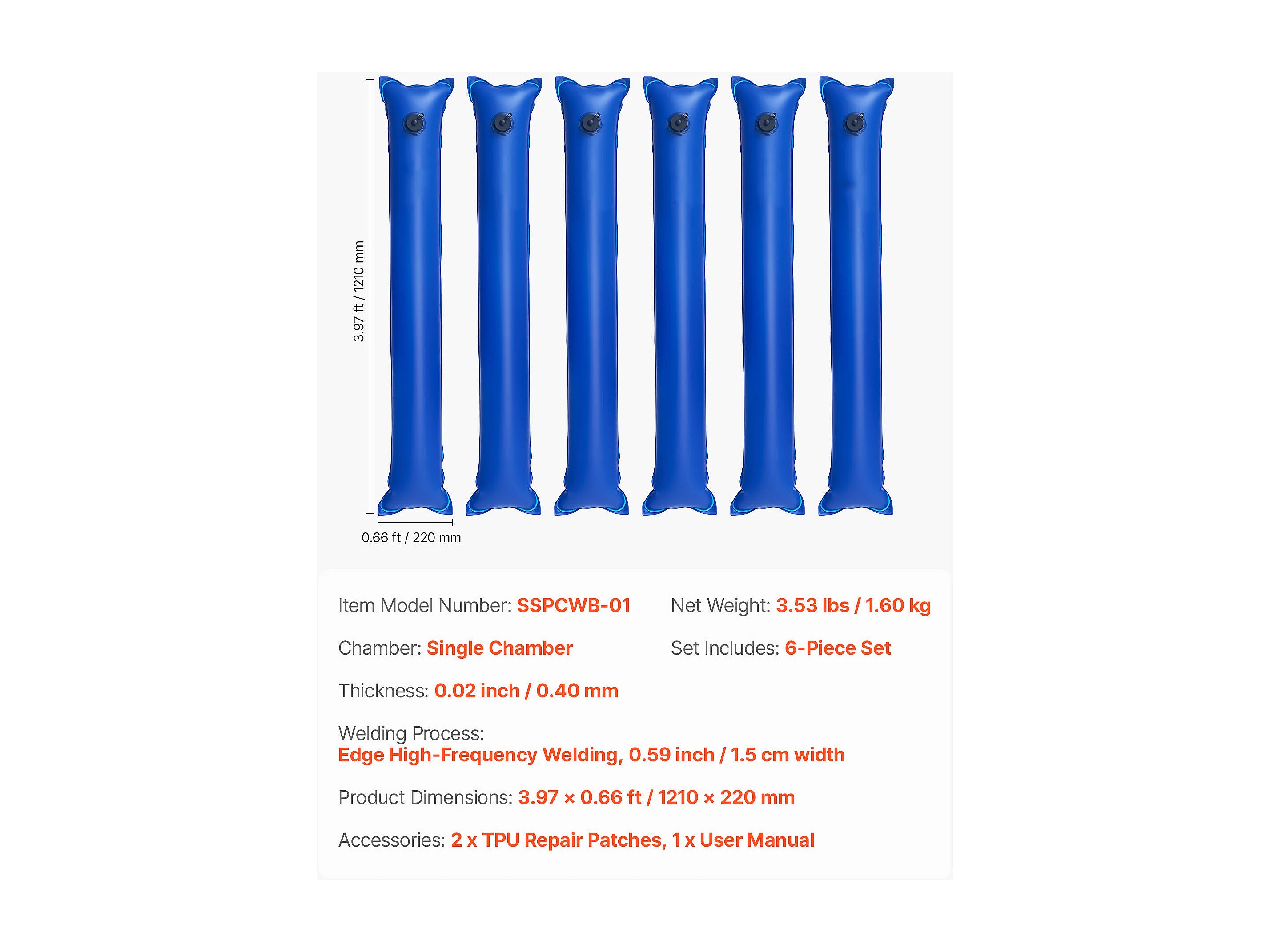 Saco de Agua SucceBuy para Lona de Piscina, Lote de 6, Saco de Lastrado de Agua de Cámara Simple, 1,2 m, Sacos en Tubo Lastrados PVC Espesor 0,4 mm