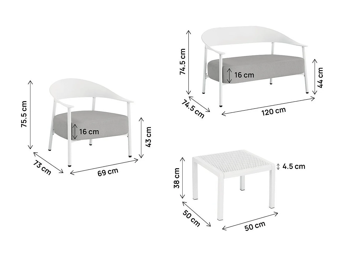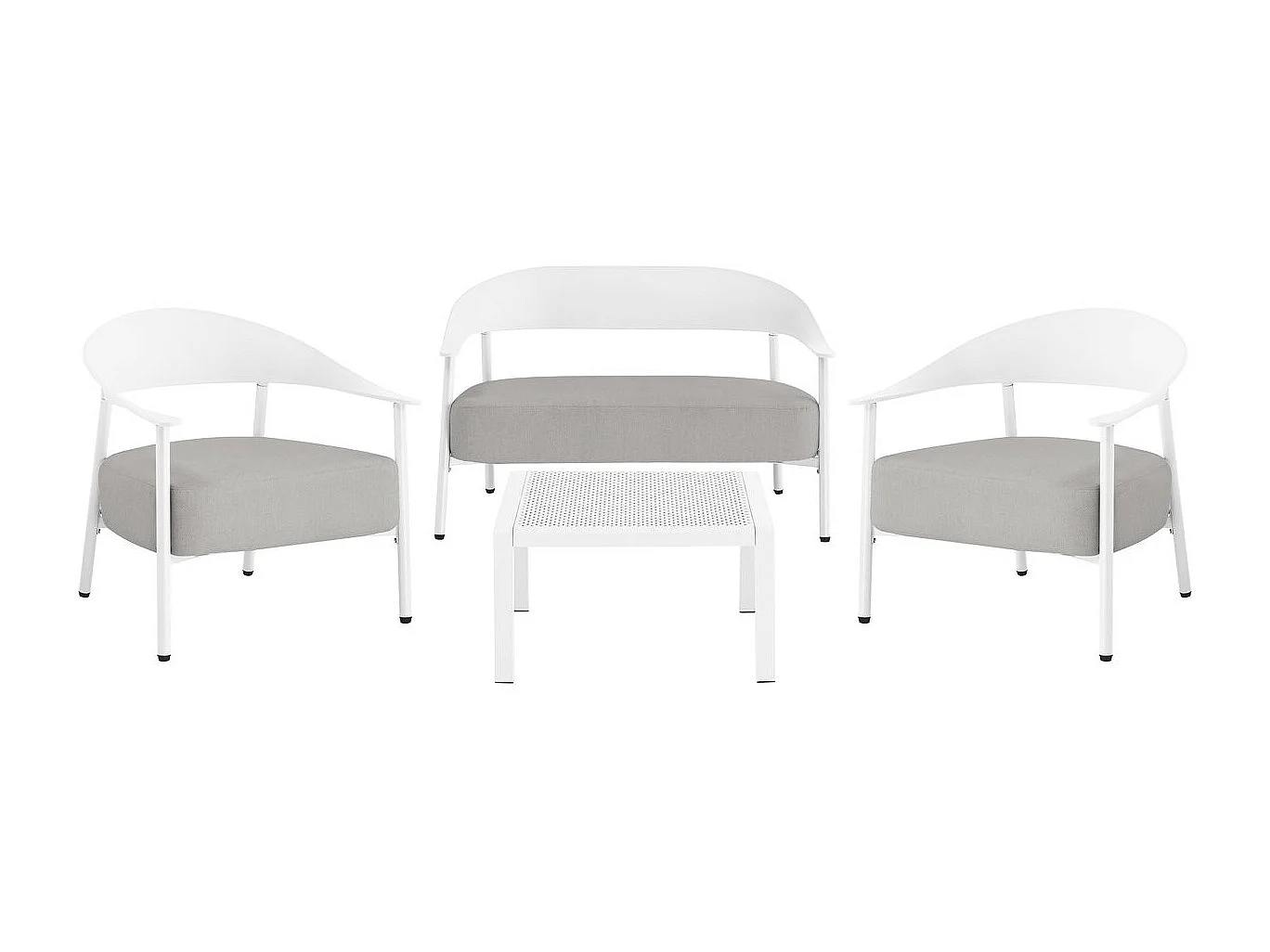 Salón de jardín Céora blanco para 4 personas en plástico resistente con cojines gruesos y cómodos