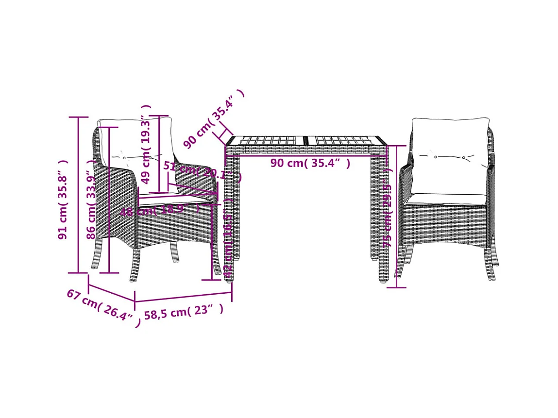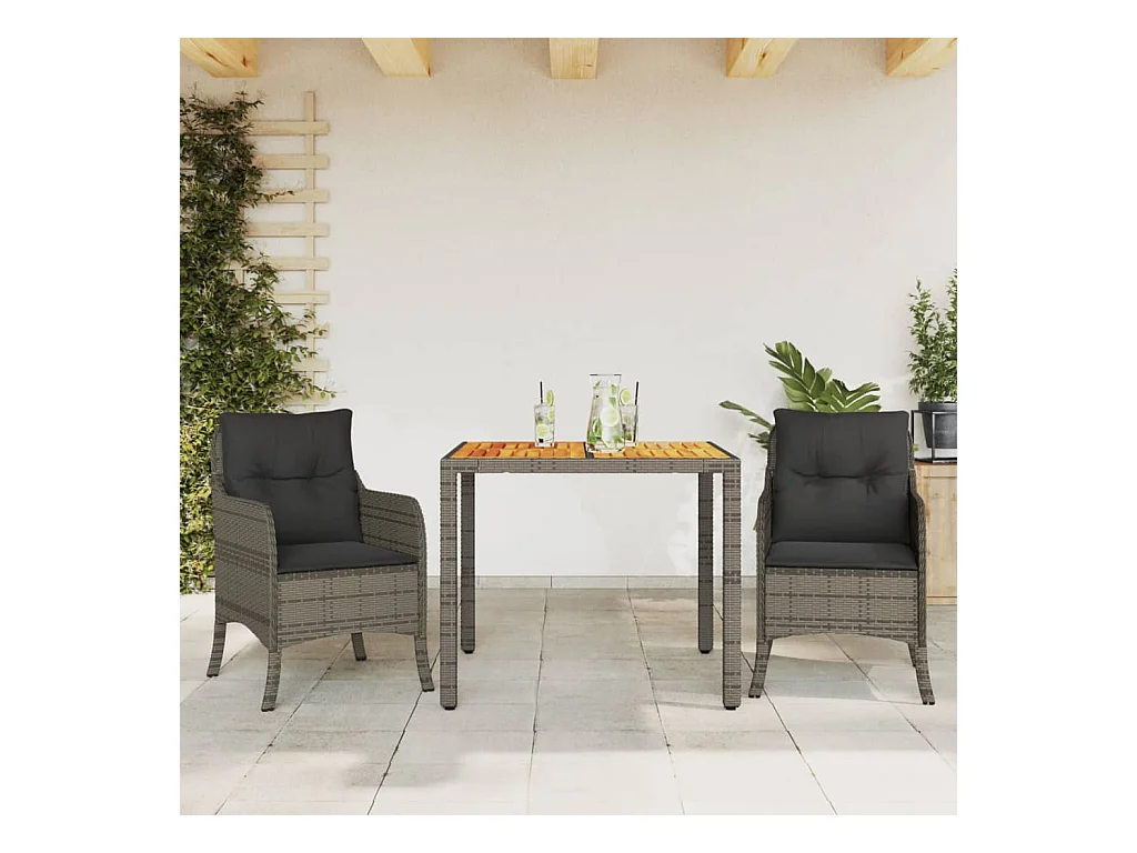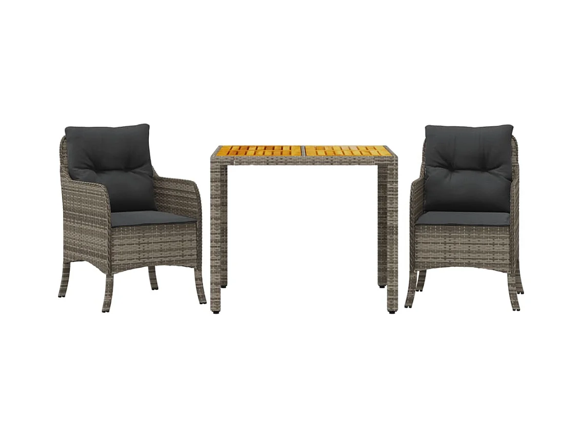 Set de comedor jardín 3 piezas con cojines ratán PE acacia gris