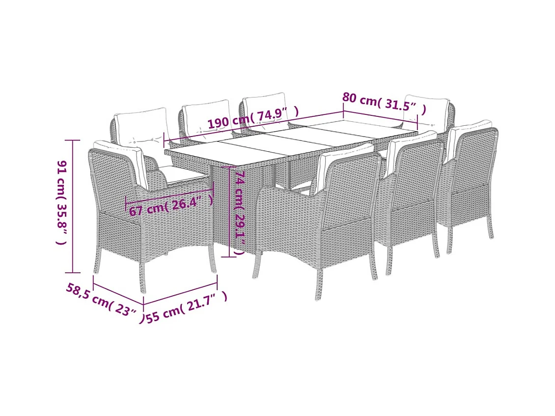 Set comedor jardín 9 piezas cojines ratán sintético vidrio beige