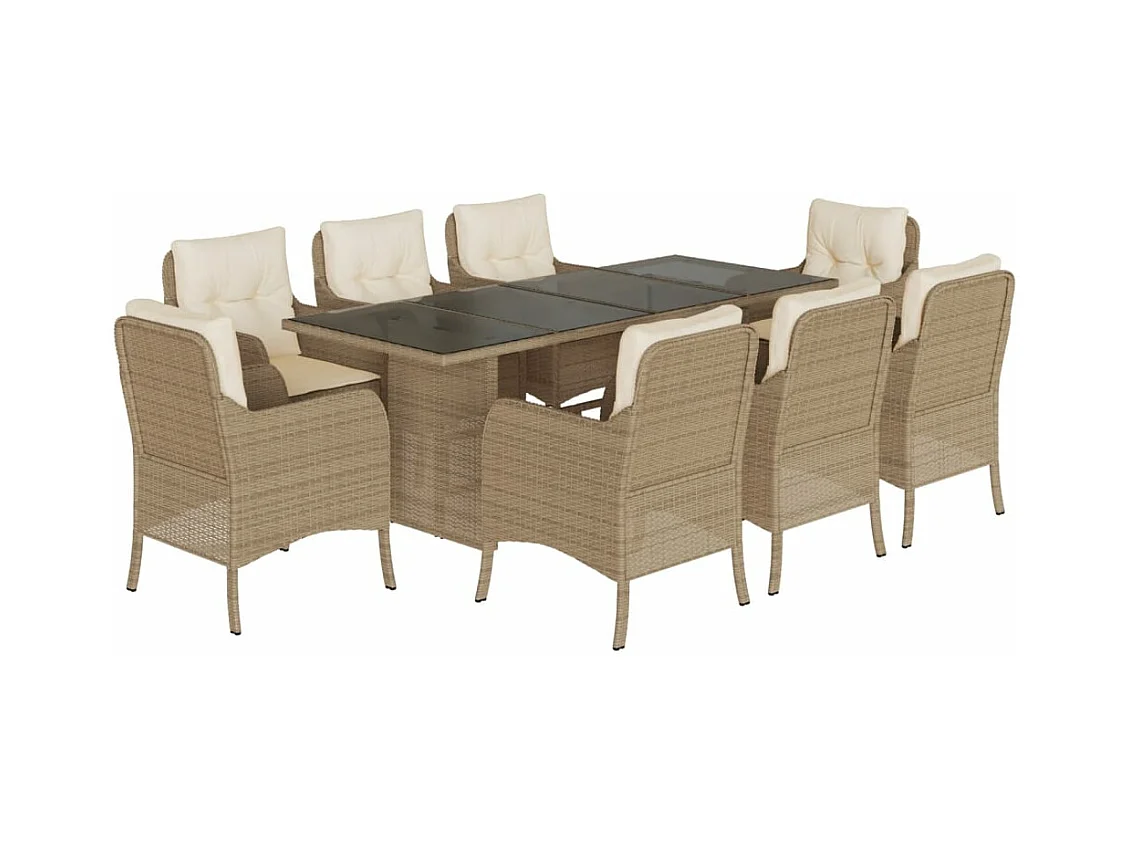Set comedor jardín 9 piezas cojines ratán sintético vidrio beige