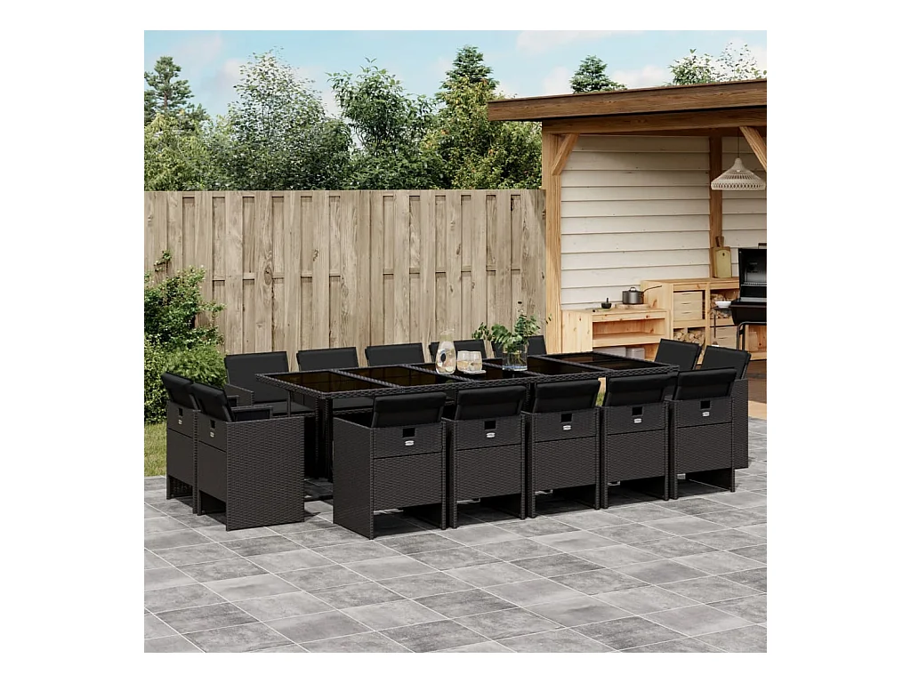 Set comedor de jardín con cojines 15 piezas ratán sintético negro