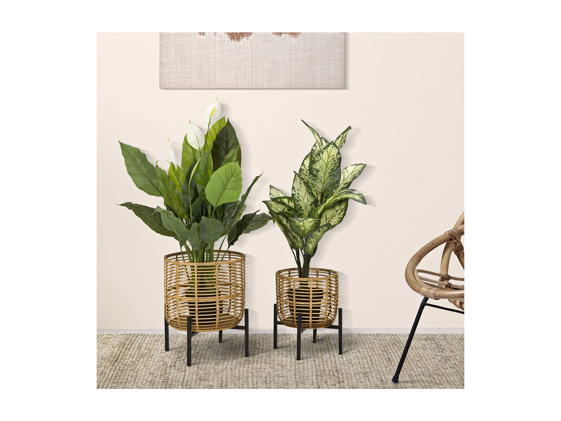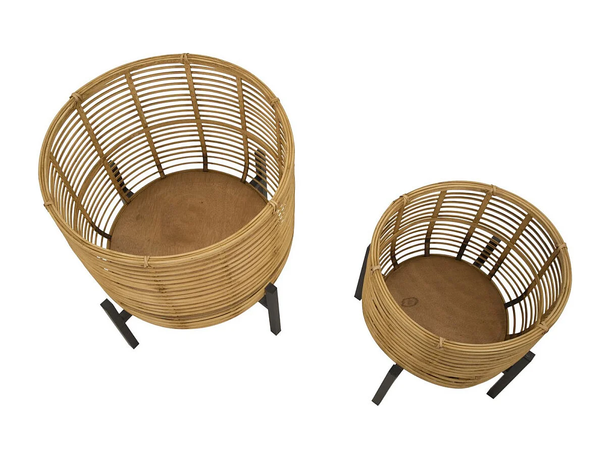 Set de 2 portamacetas redondos de ratán con soporte de metal negro Zeyok