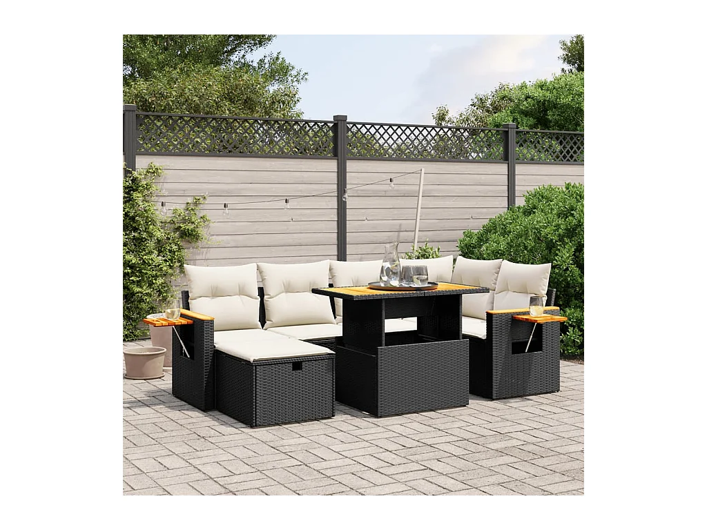 Set de comedor de jardín 7 piezas y cojines ratán sintético negro