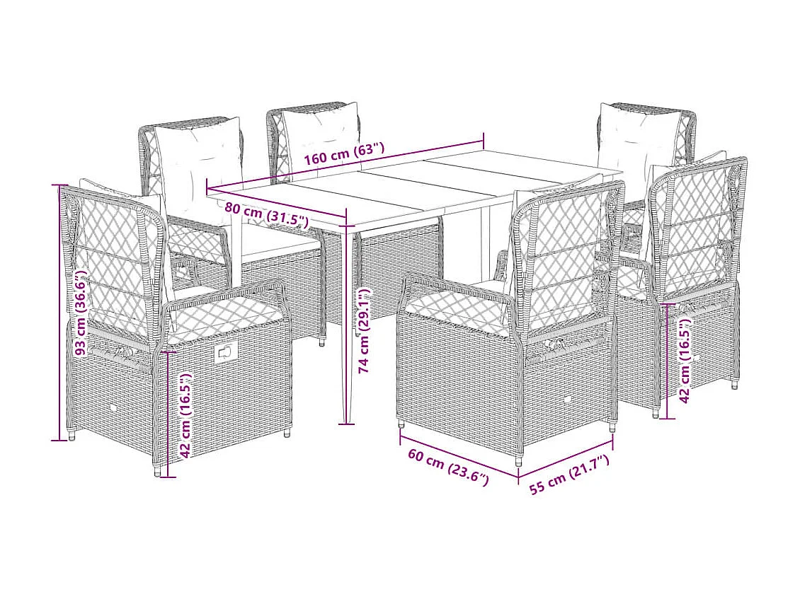 Set de comedor de jardín 7 pzas y cojines ratán sintético negro