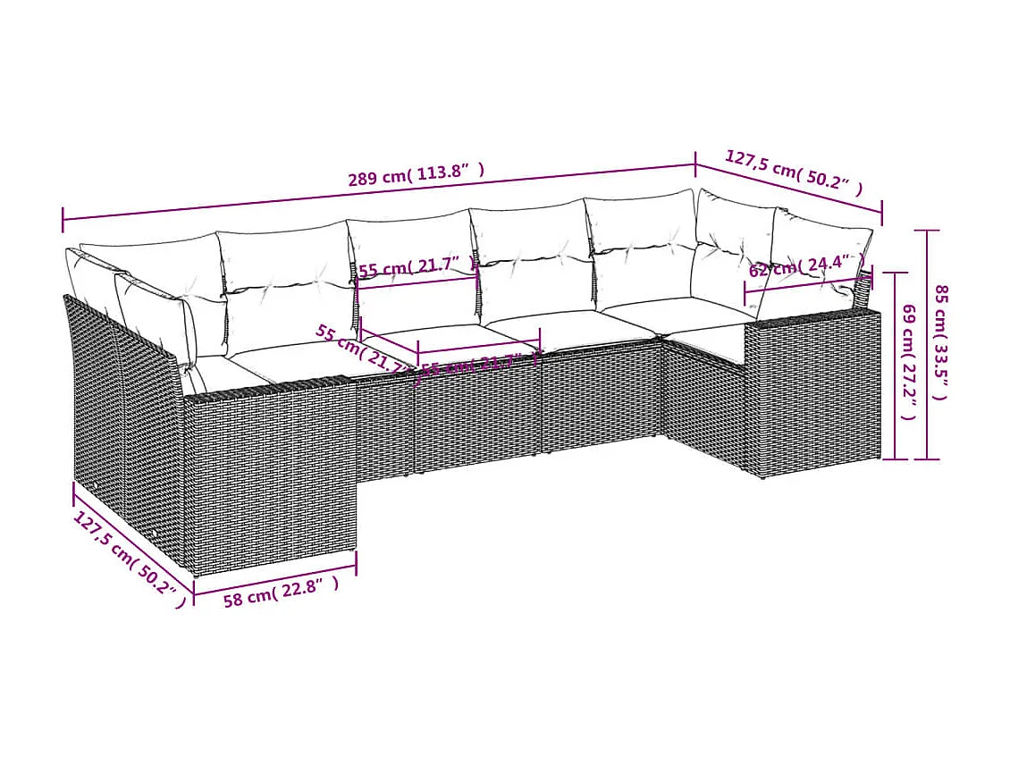 Muebles de jardín de 7 piezas con cojines de resina tejida en negro.