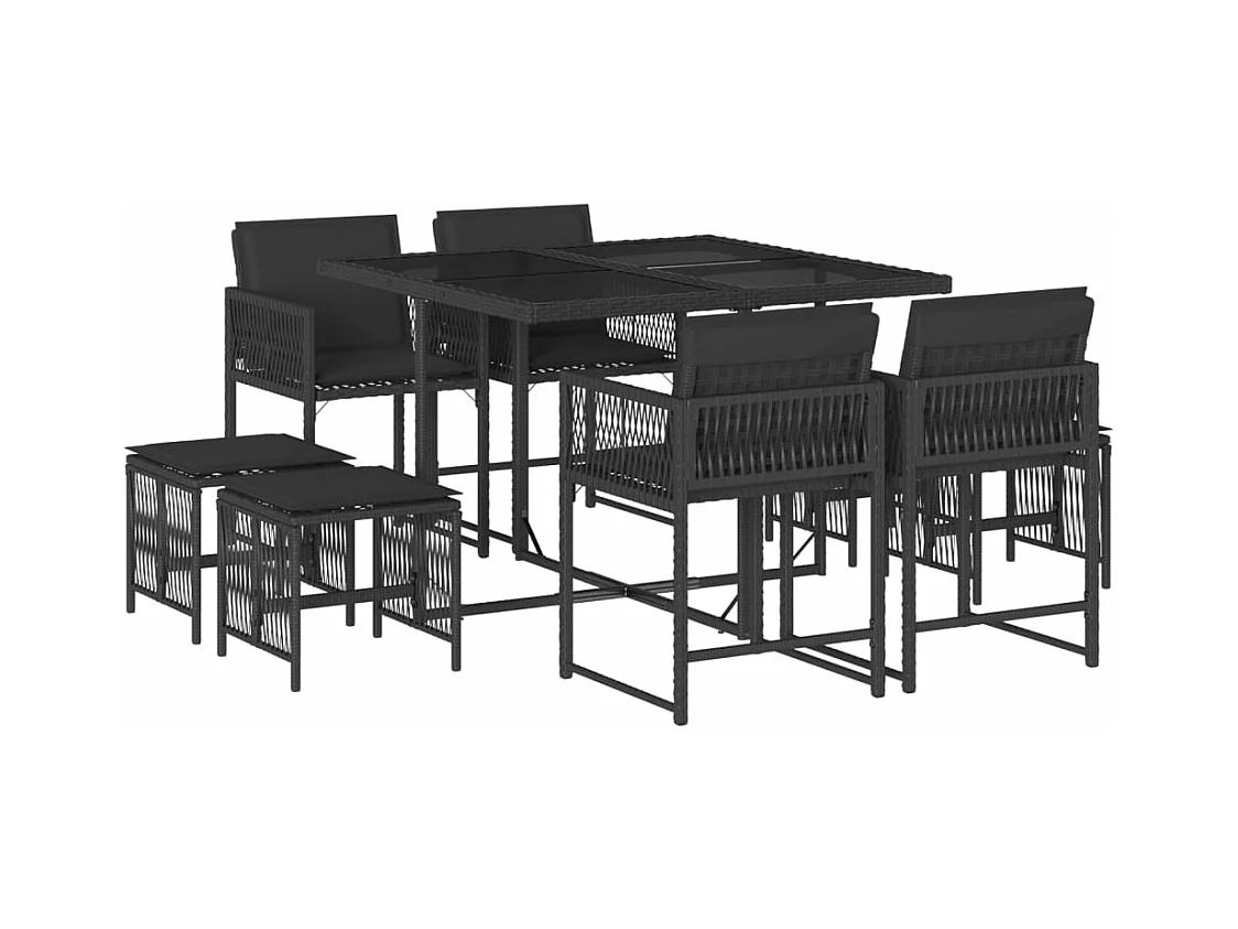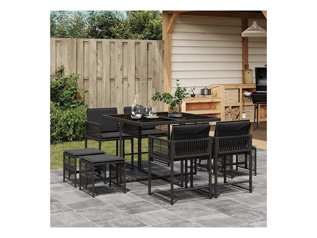 Set de comedor de jardín 9 pzas y cojines ratán sintético negro