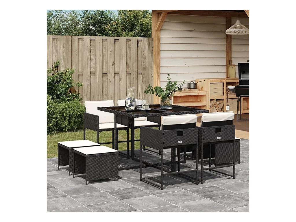 Set de comedor de jardín 9 pzas y cojines ratán sintético negro ES988725