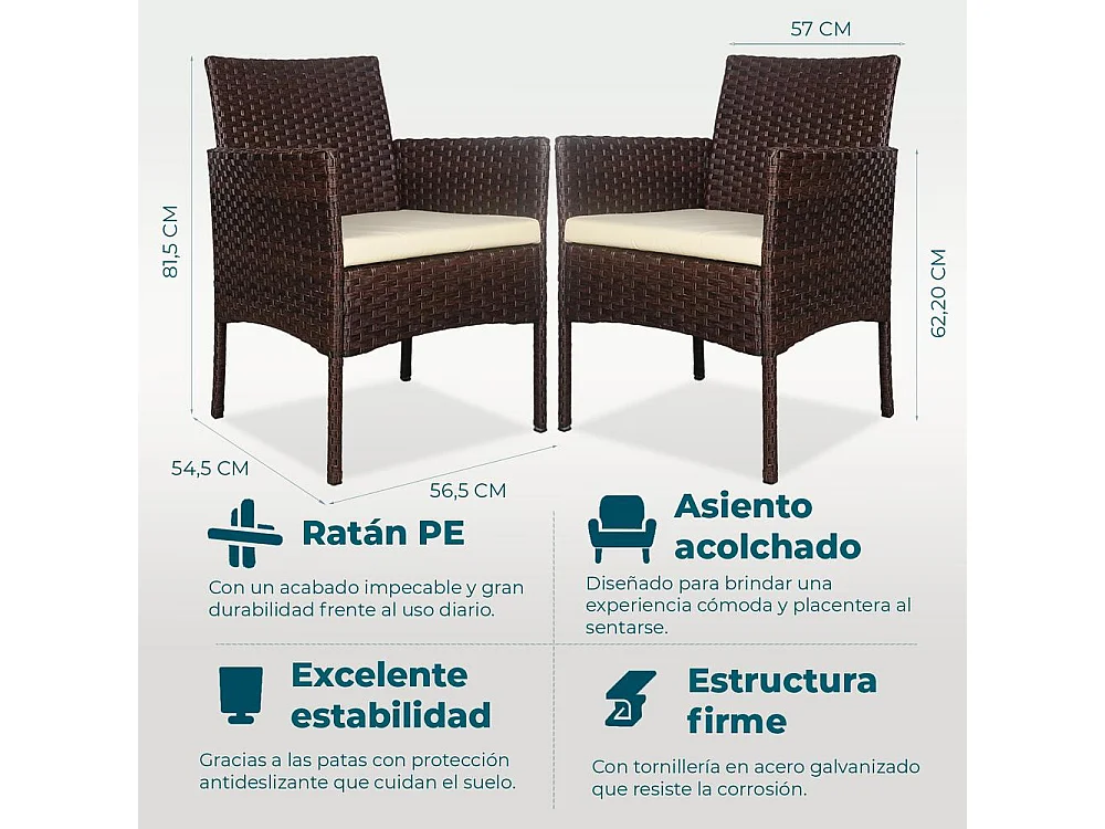 Set de jardín de ratán – 3 piezas, 2 sillas con cojines y mesa de cristal – Yoevu