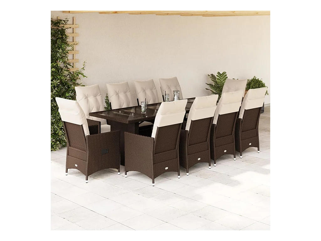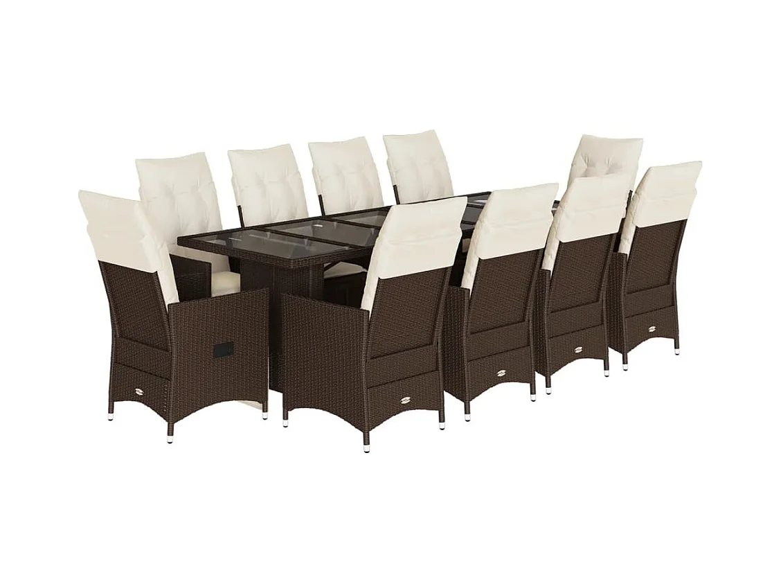 Set de mesa y sillas de jardín 11 pzs y cojines ratán PE marrón