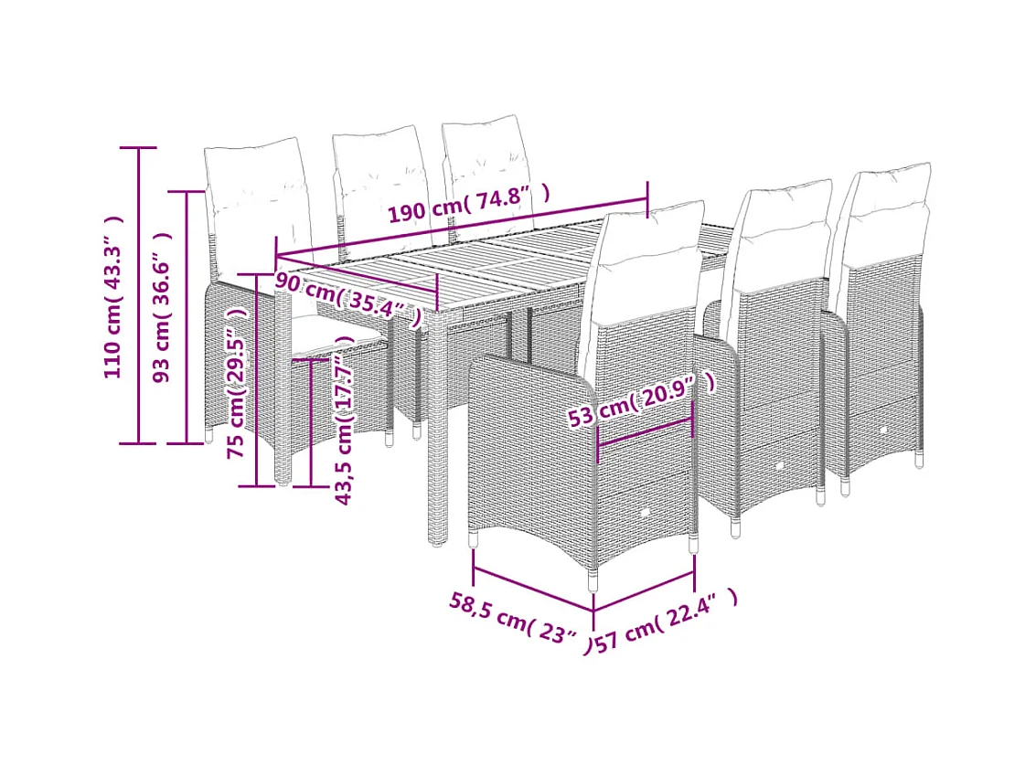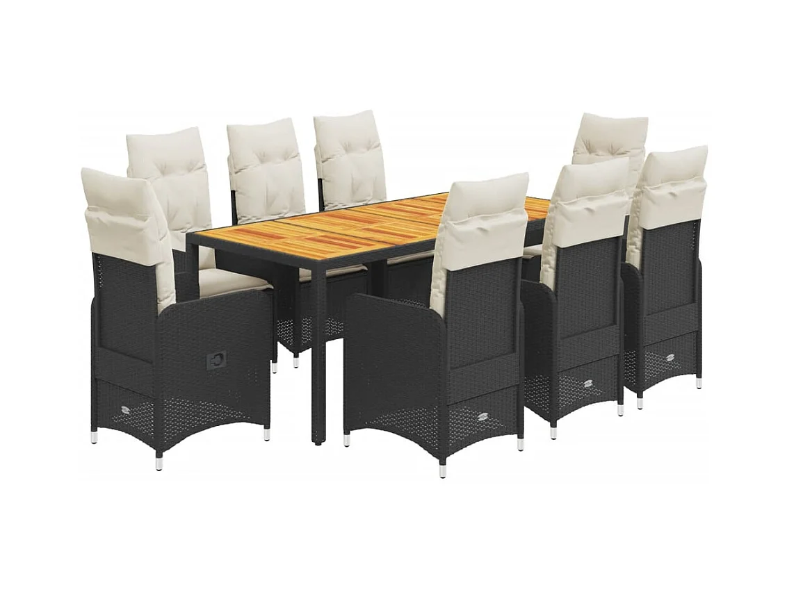 Set de mesa y sillas de jardín 9 pzas y cojines ratán PE negro