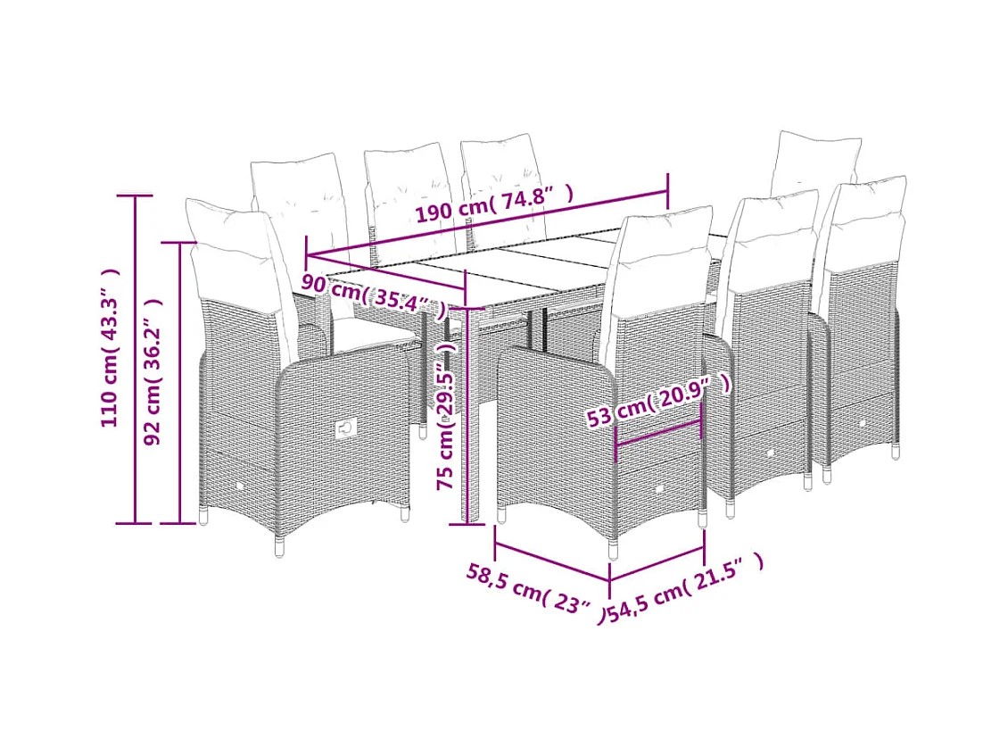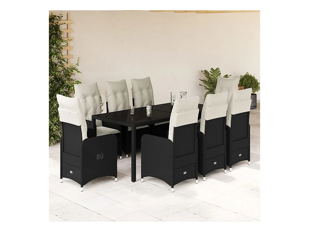 Set de mesa y sillas de jardín 9 pzas y cojines ratán PE negro