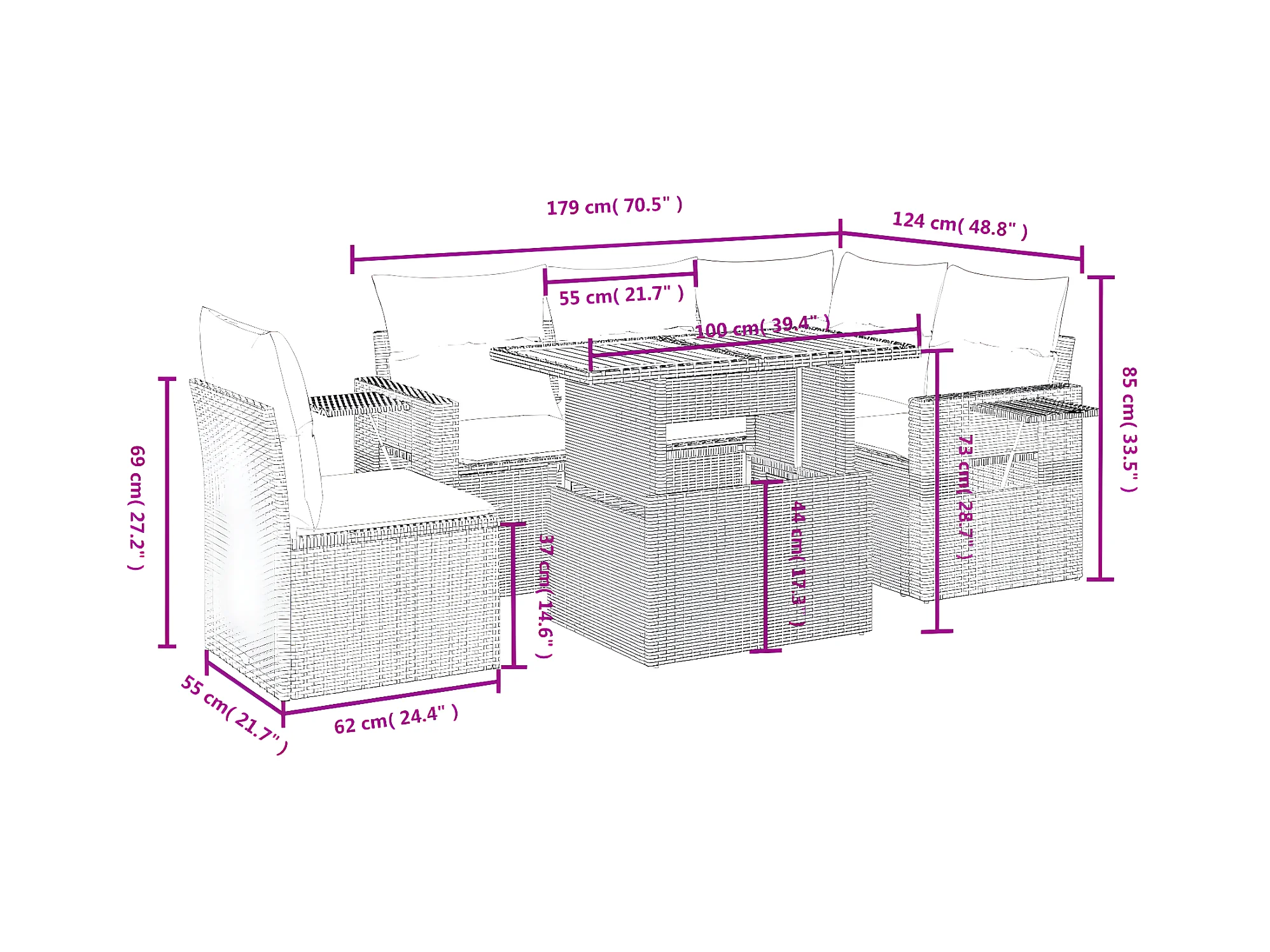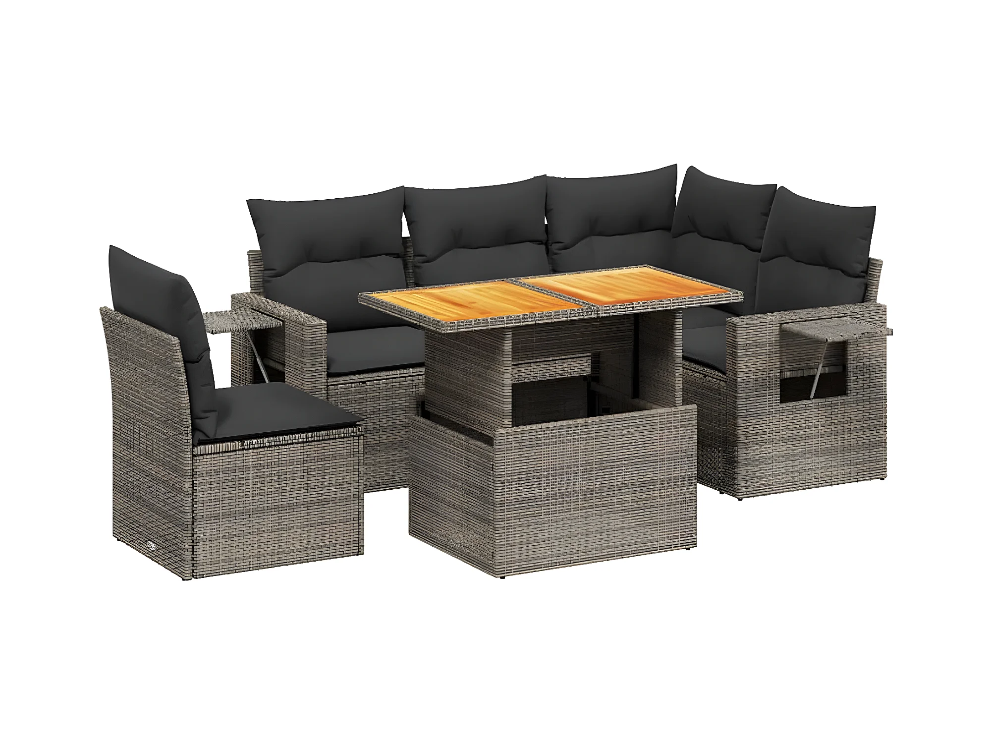 Set de muebles de jardín 6 piezas y cojines ratán sintético gris