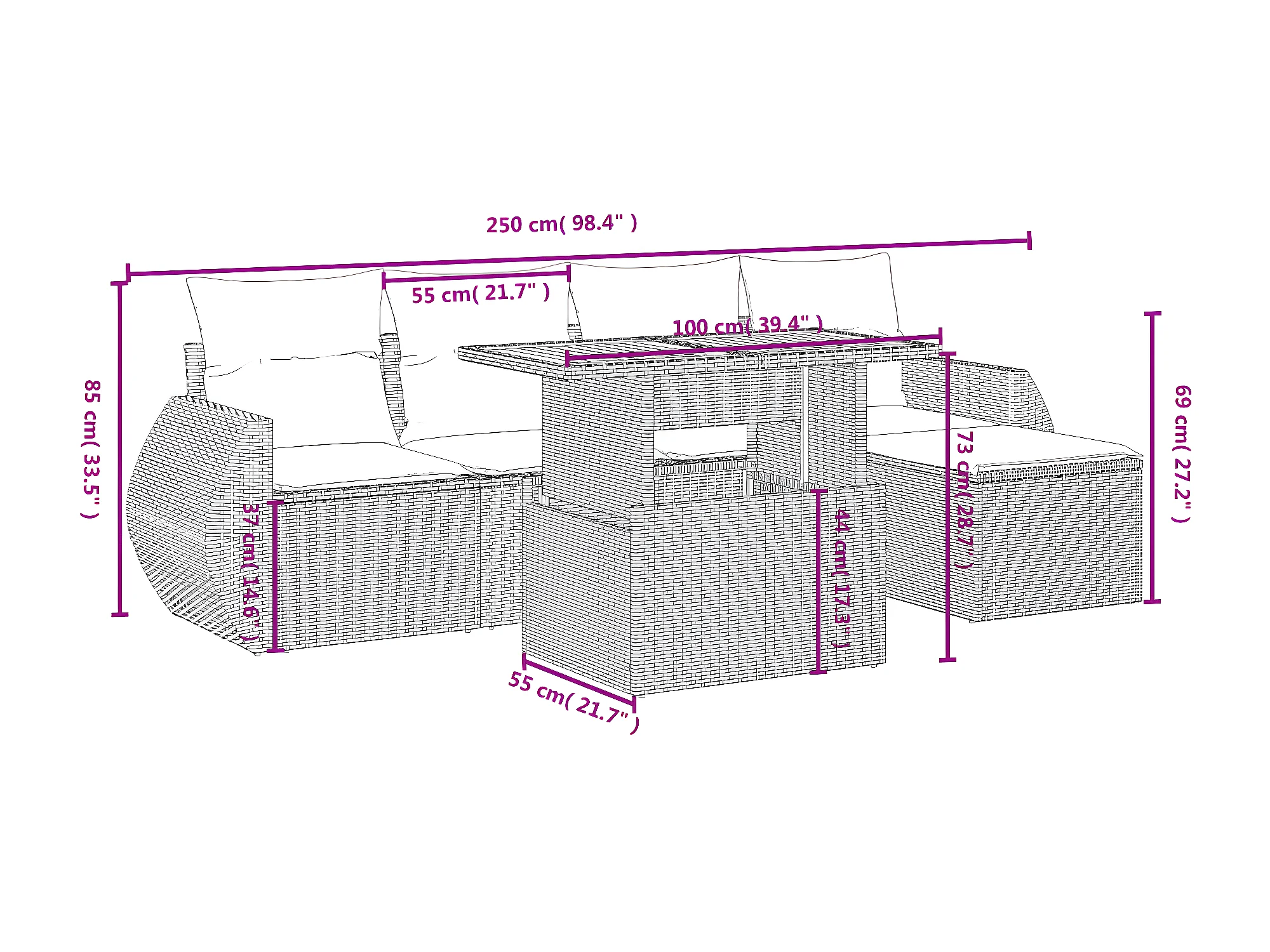 Set de muebles de jardín 6 piezas y cojines ratán sintético gris
