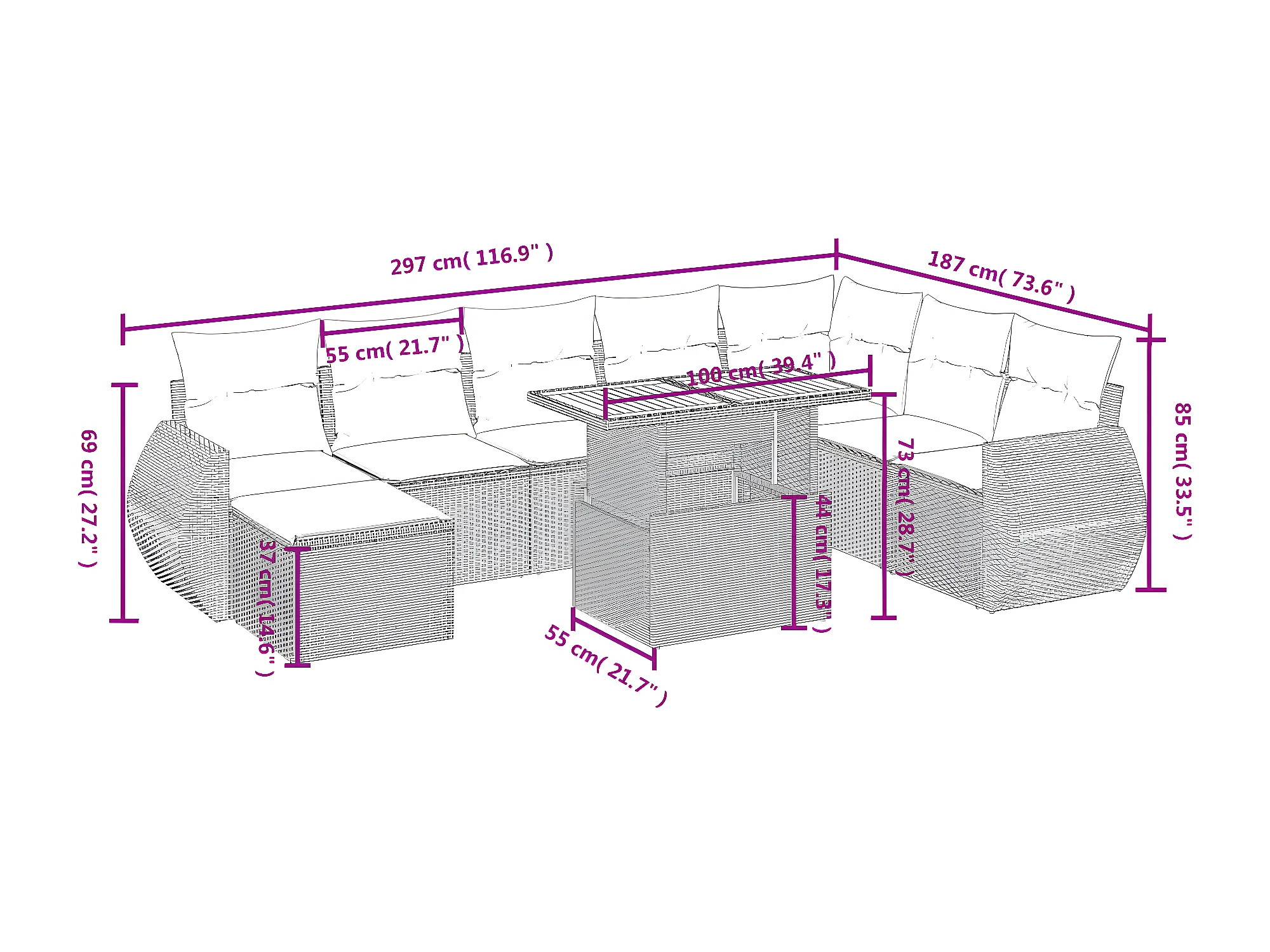 Set de muebles de jardín 9 piezas y cojines ratán sintético gris