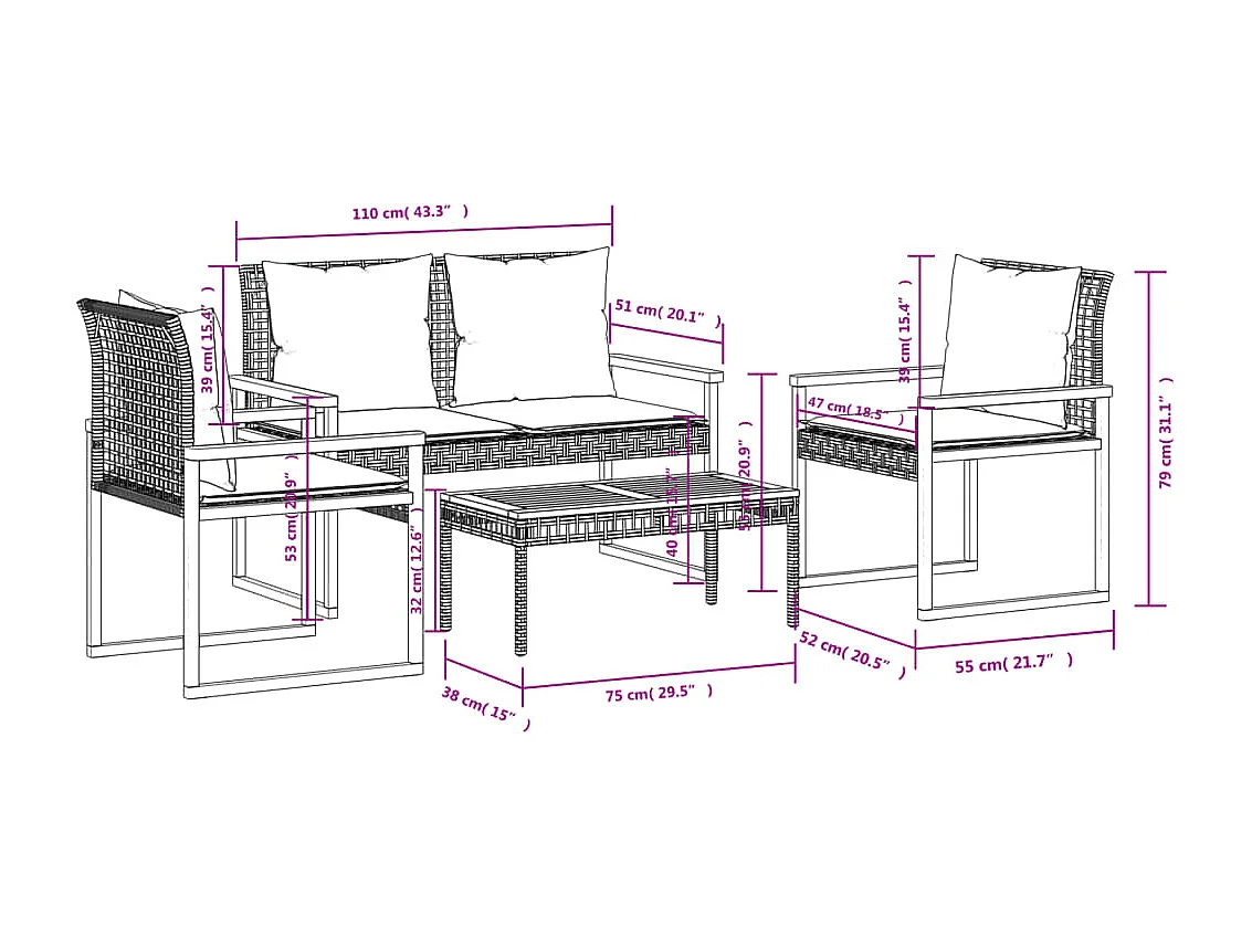 Set muebles de jardín 4 piezas y cojines ratán sintético beige