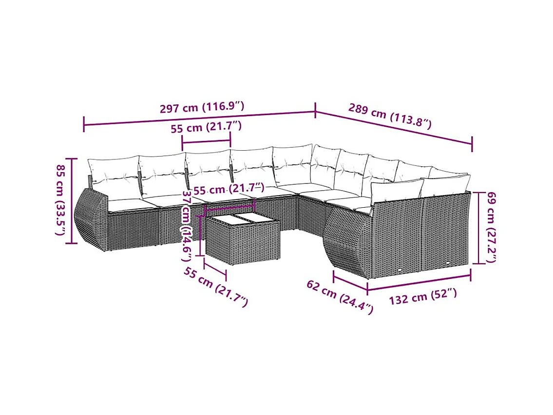 Set de sofás de jardín 11 piezas y cojines ratán sintético gris