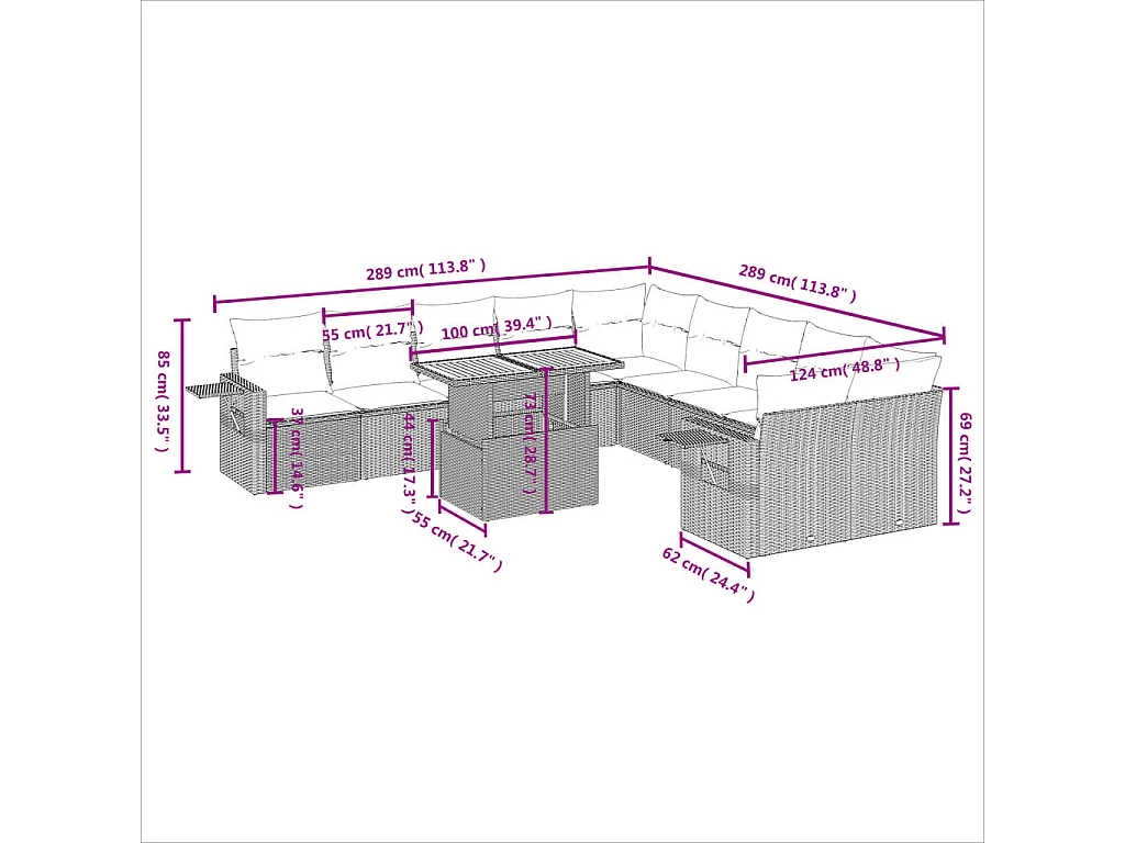 Set de sofás de jardín 11pzas con cojines ratán sintético beige