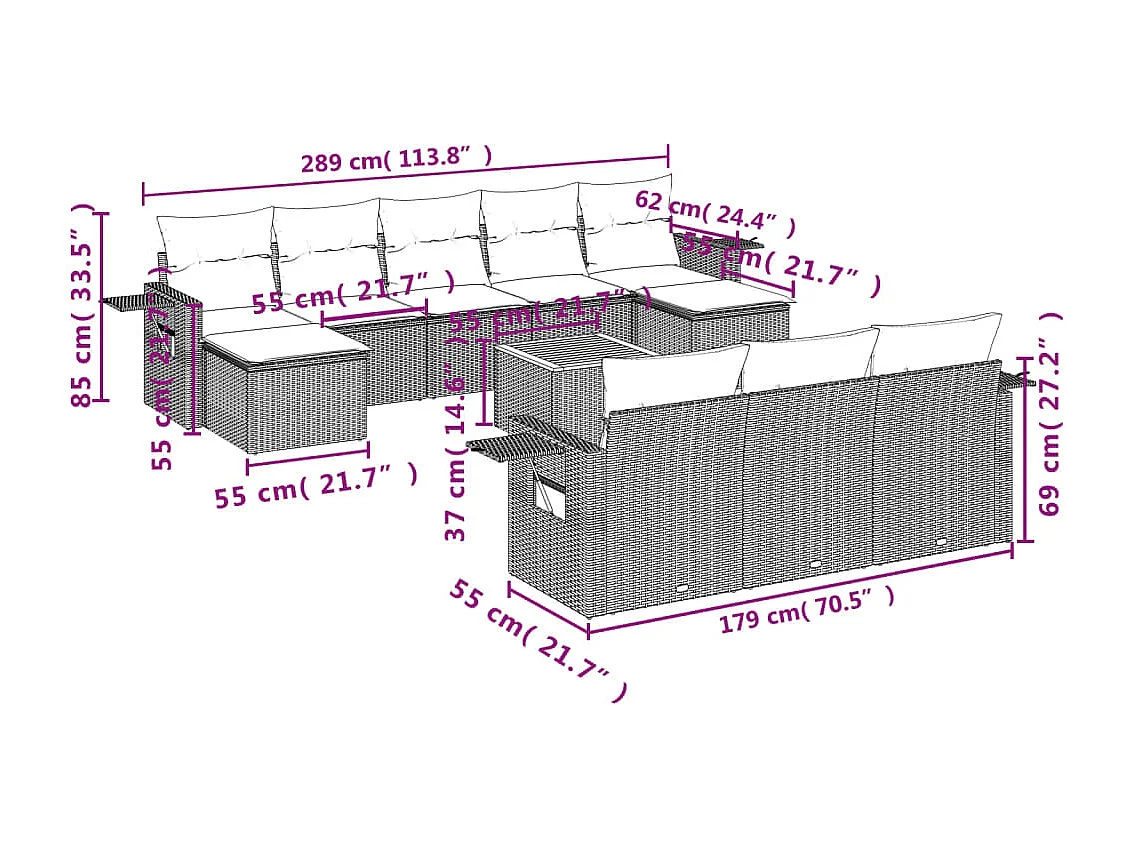 Muebles de jardín 10 piezas con cojines de resina tejida negra.
