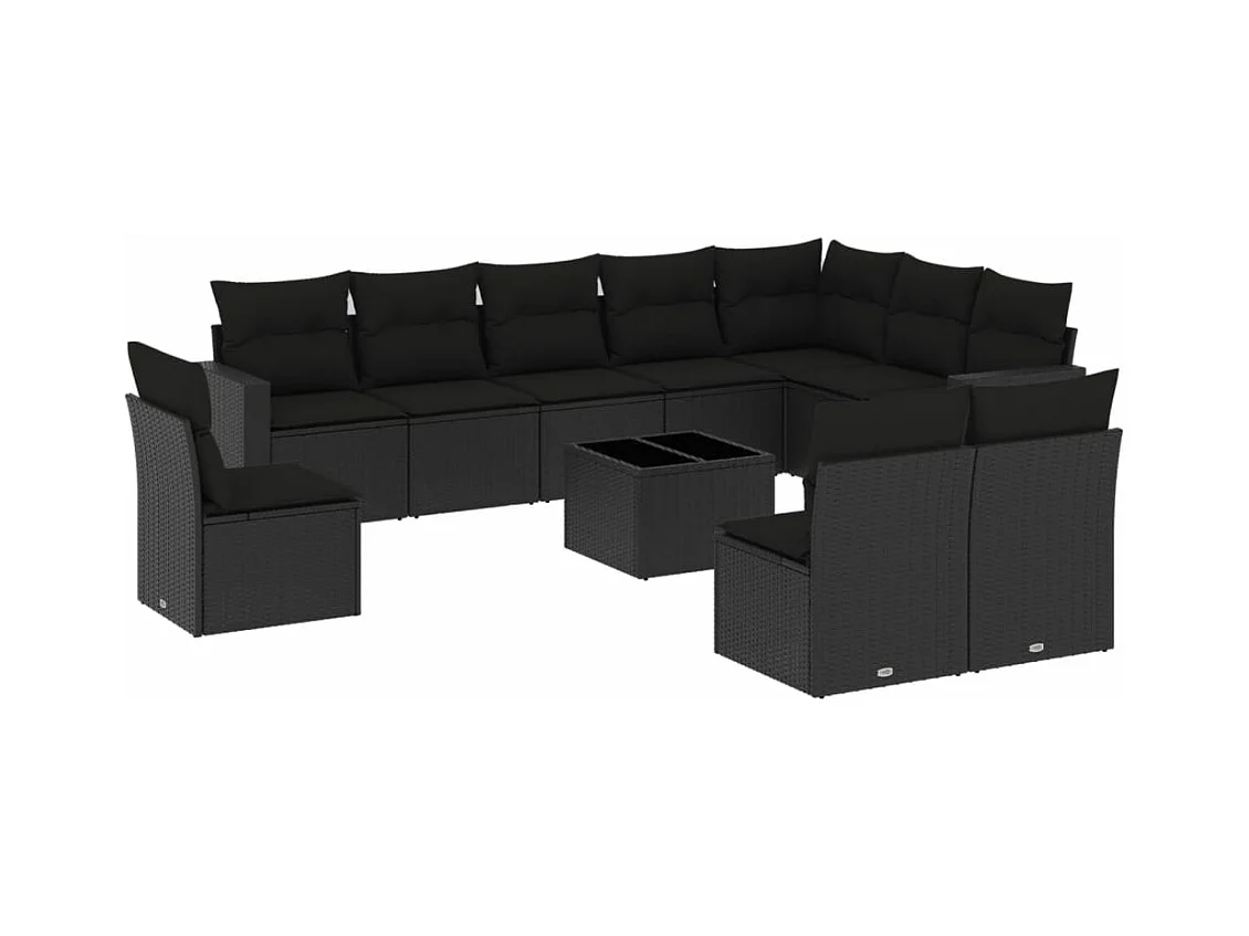 11 muebles de jardín con cojines de resina tejida en negro.