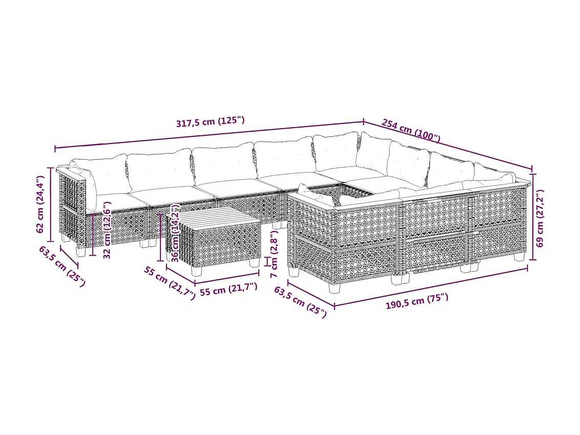 Set de sofás de jardín 11 pzas y cojines ratán sintético negro