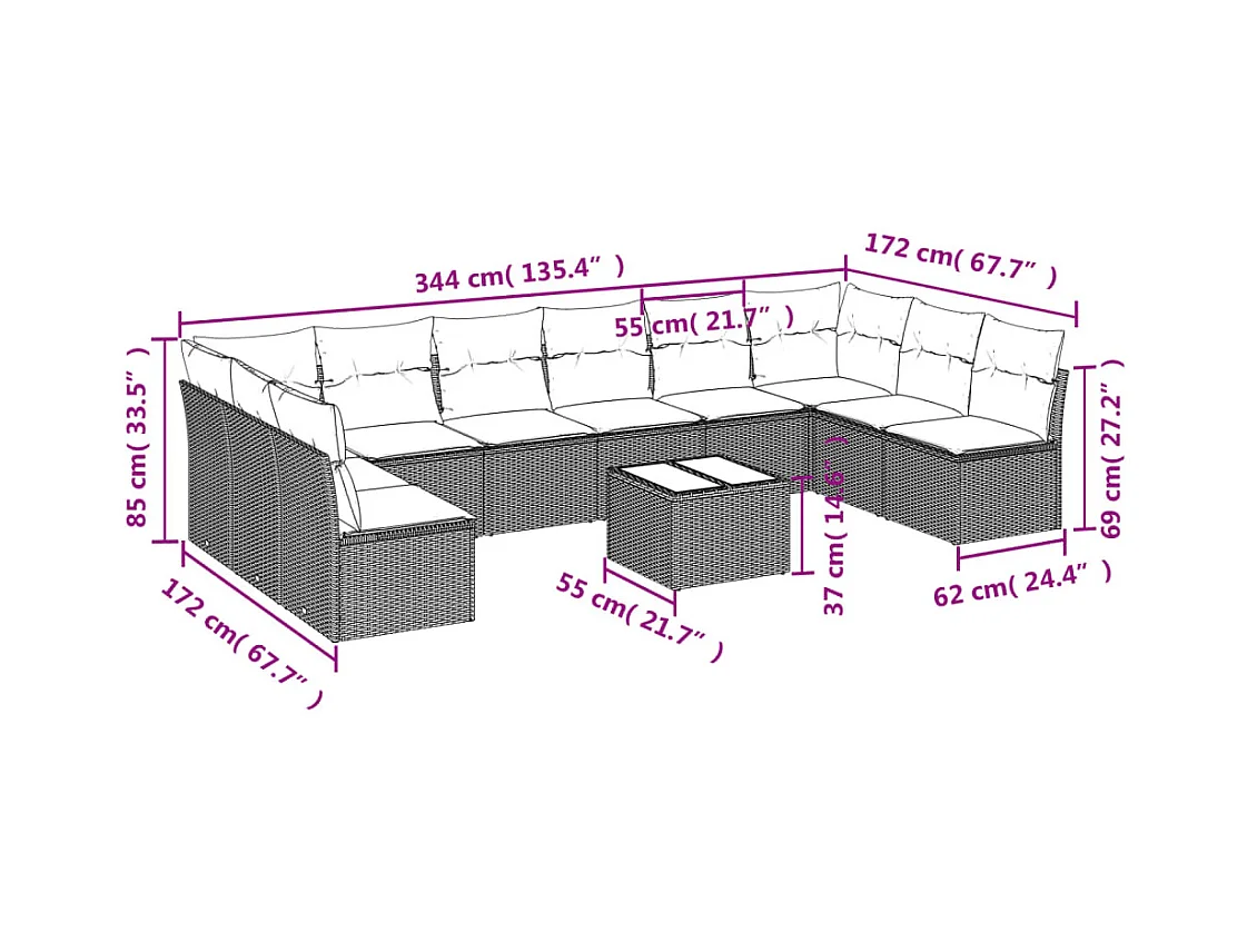 Set de sofás de jardín 11piezas con cojines ratán sintético beige