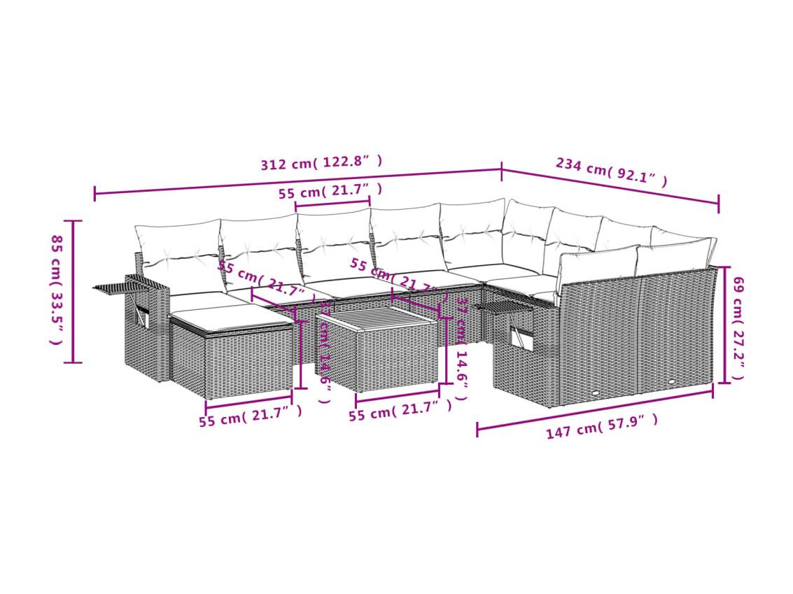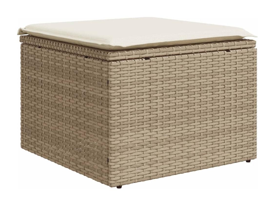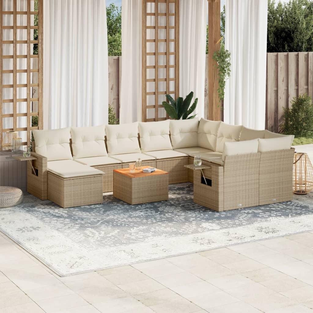 11 muebles de jardín con cojines de resina tejida en color beige.
