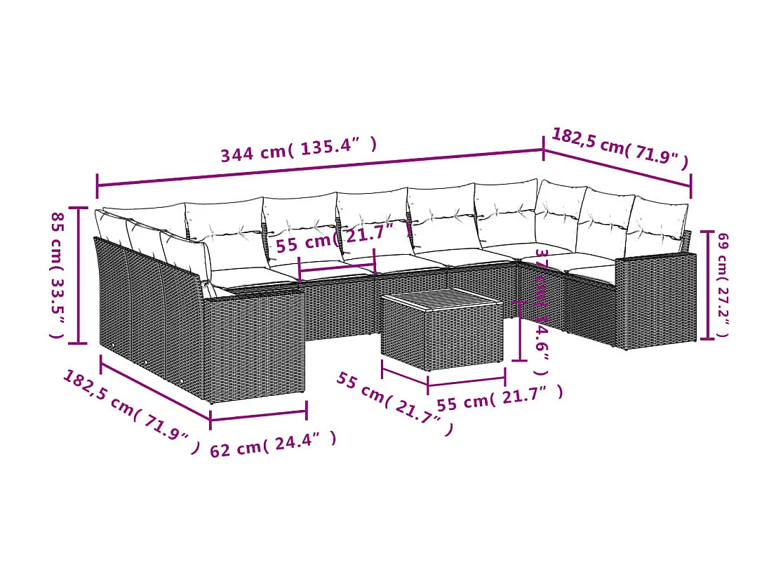 11 muebles de jardín con cojines de resina tejida en color beige.